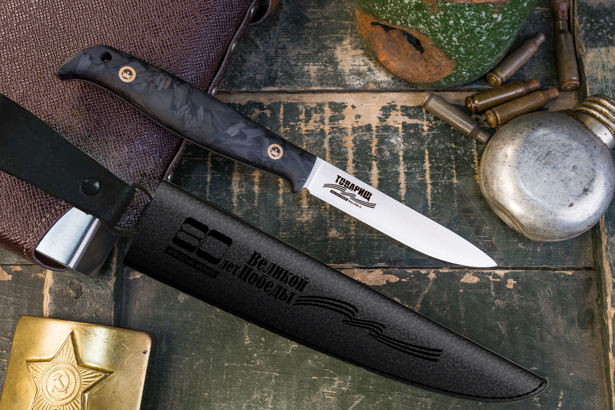 Нож ТОВАРИЩ (как и 2025 год) будет посвящен 80-летию победы в Великой Отечественной Войне, поэтому графика на клубнике соответствующая.