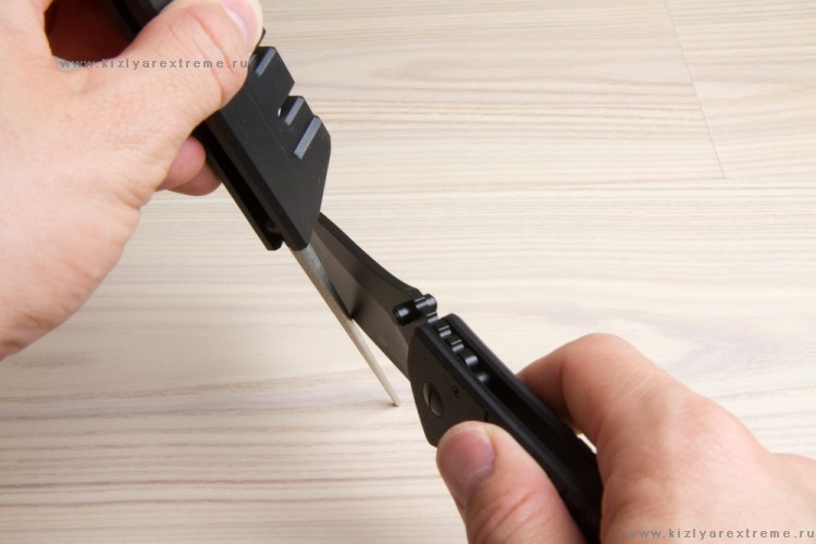 Надежно удерживая инструмент, поместите клинок в слот под прямым углом (90°) и с небольшим усилием потяните на себя. Если ваш клинок сильно затуплен, начните работу в карбидном слоте (HRC90) и продолжайте пока на режущей кромке не перестанет собираться стружка (регулярно счищайте ее).