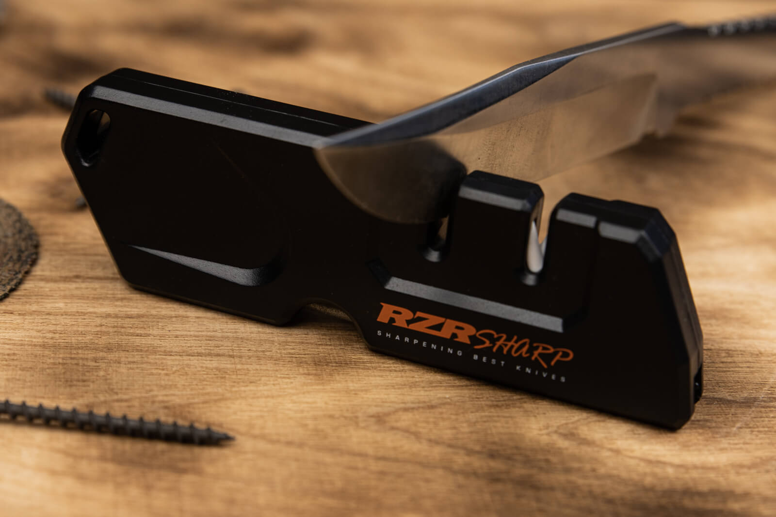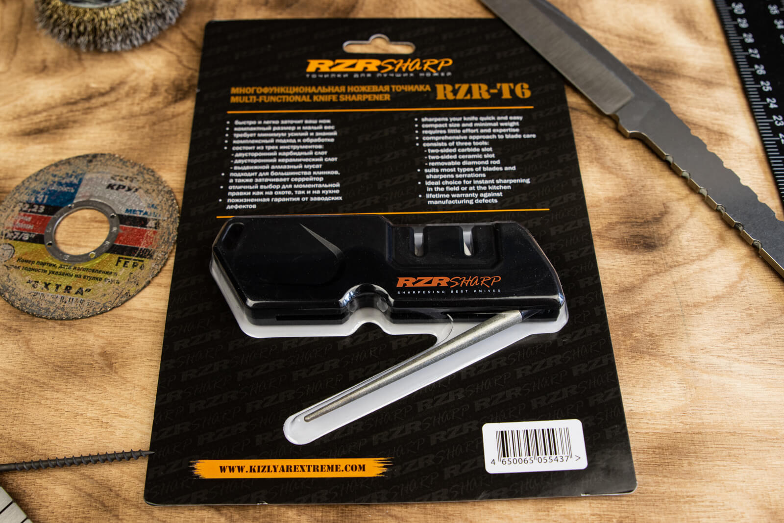 Легкий и компактный точильный инструмент RZR-T6 быстро и без усилий заточит и поправит режущую кромку большинства ножей, а также серрейторные клинки.