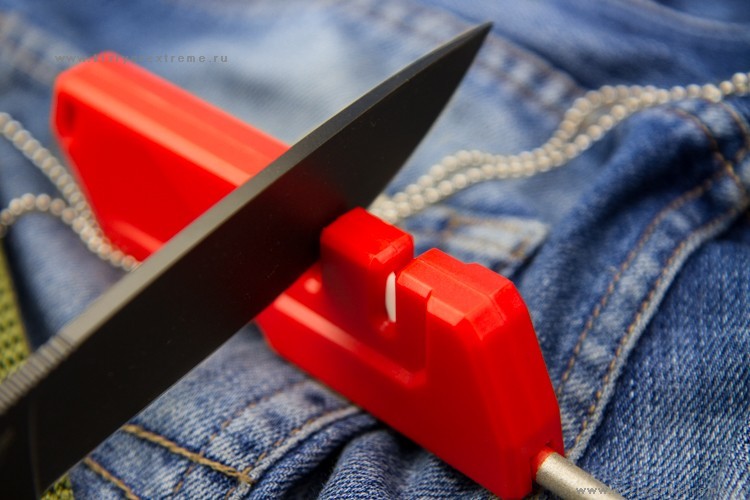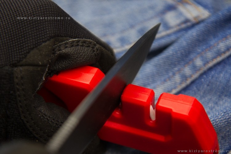 Карбидный слот предназначен для более быстрого съема материала и заусенцев с режущей кромки, выпрямляя ее, а керамический слот необходим для последующей мягкой обработки и правки клинка.