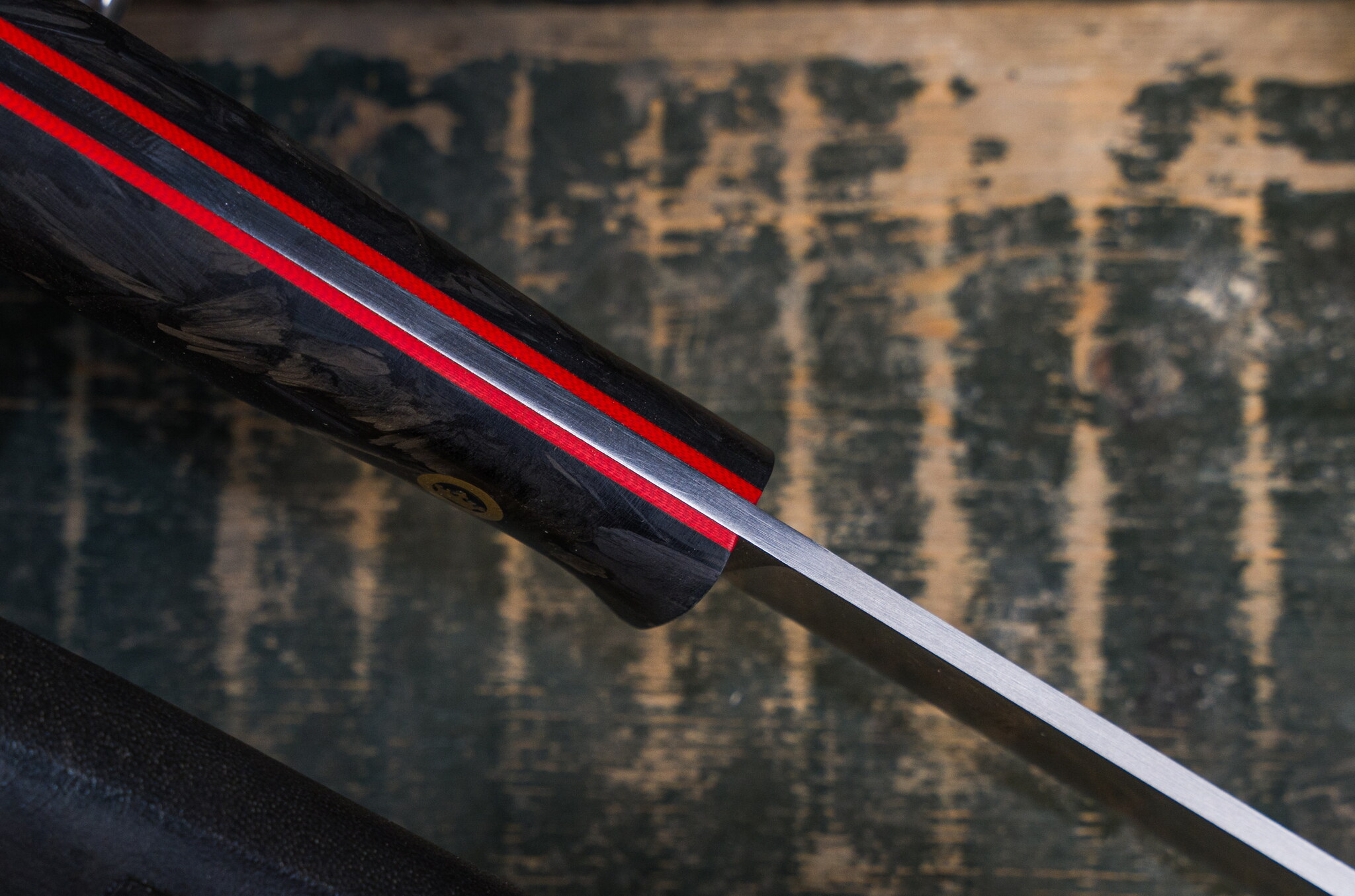 - Рукоять из хаотичного карбона с красными проставками собрана на авторских пинах с короной Kizlyar Supreme.