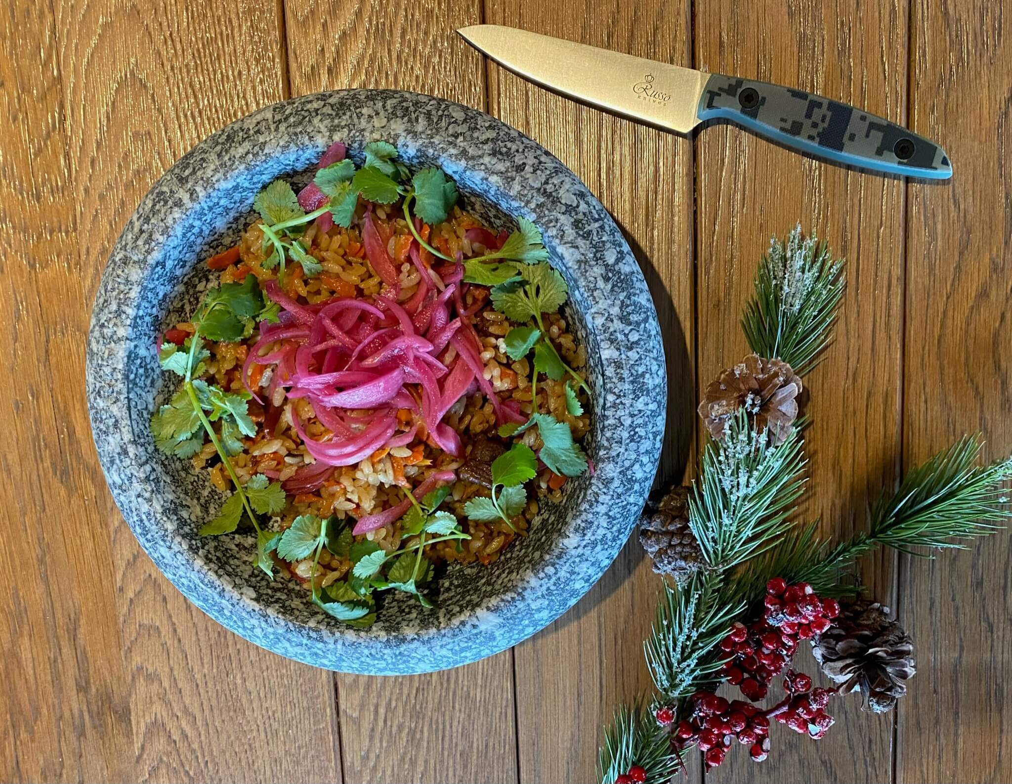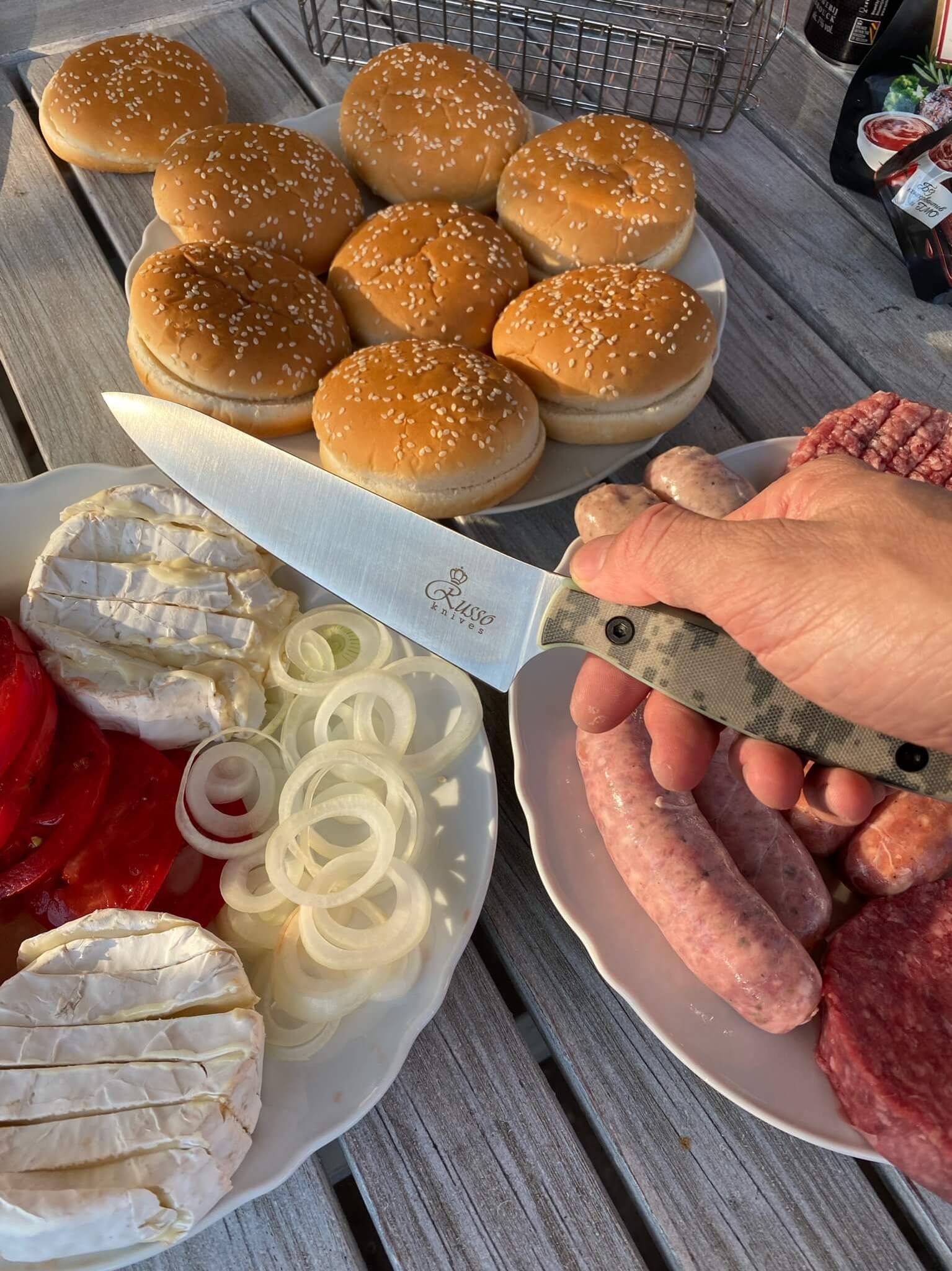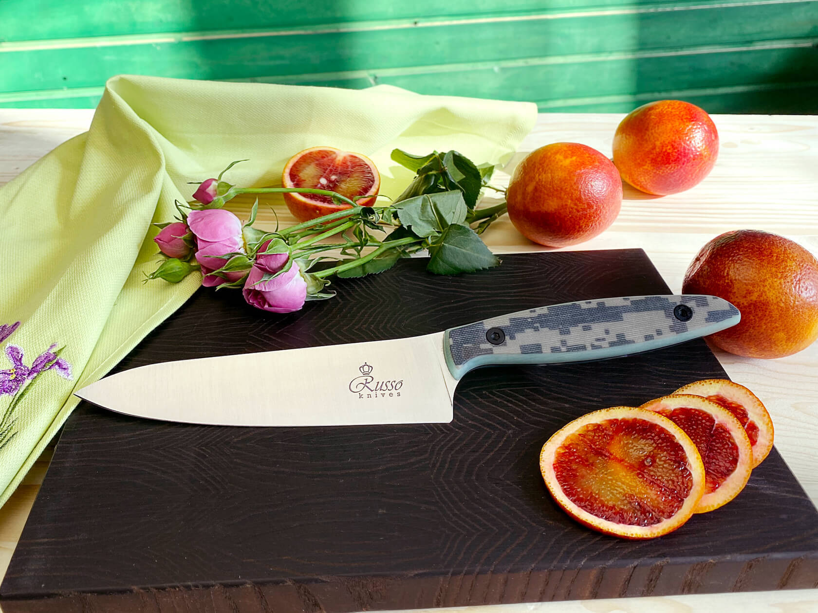 Рукоять ножа выполнена под небольшим углом к клинку, чтобы не напрягать руку во время нарезки. Сама рукоять имеет в сечении форму прямоугольника со скругленными углами, что позволяет сразу легко почувствовать нож, предотвращает проворачивание рукоятки в руке, а главное, позволяет менять хват и взять нож удобно для конкретной задачи.