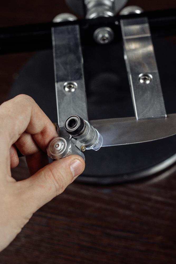 Микроскоп позволяет наблюдать состояние режущей кромки и заусенца в процессе заточки. В нем применена технология зума и подсветки. Для использования, к ножу нужно поднести линзу микроскопа, включить LED подсветку и настроить резкость. Работает карманный микроскоп от 3 батареек.