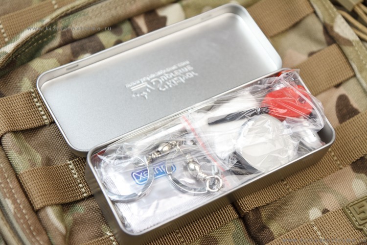 Камуфлированный набор выживания включает в себя полностью MOLLE-совместимый подсумок и жестяной футляр с набором инструментов и предметов, необходимых для экстремальных условий выживания.