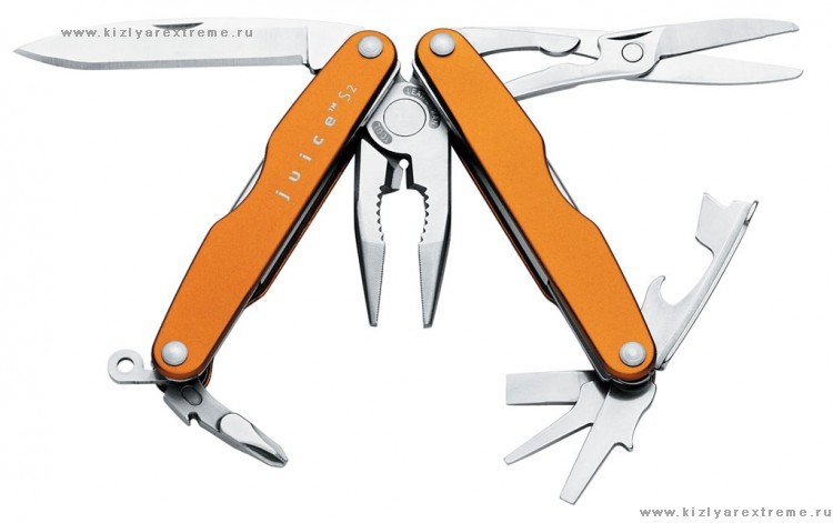 Модель Juice S2 – это маленький инструмент с большими возможностями. Малый вес и габарит определяет круг их использования. Из-за малого габарита и веса, а также большого количества инструментов (12) пользуется заслуженным уважением у туристов. Она идеально подходит для пеших походов, в том числе и по городу. Уместна в женской сумочке и портфеле менеджера. Эти модели комплектуются презентабельной подарочной упаковкой и выполняются в различной цветовой гамме: оранжевый и серый. Поэтому они пользуются устойчивым спросом в подарочном сегменте рынка. Функции мультитула Juice S2 могут быть расширены за счёт совместного использования с набором BIT DRIVER.