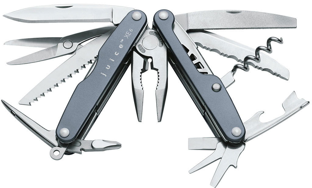 Модель Juice Xe6 – это маленький инструмент с большими возможностями. Малый вес и габарит определяет круг их использования. Из-за малого габарита и веса, а также большого количества инструментов (19) пользуется заслуженным уважением у рыбаков, охотников и прочих любителей активного отдыха. Она идеально подходит для пеших походов, в том числе и по городу. Уместна в женской сумочке и портфеле менеджера. Эти модели комплектуются презентабельной подарочной упаковкой и выполняются в различных цветах: фиолетовый и серый.