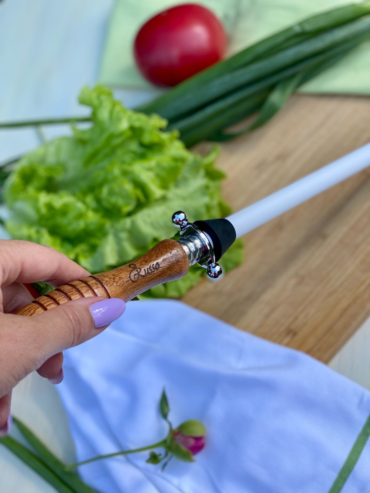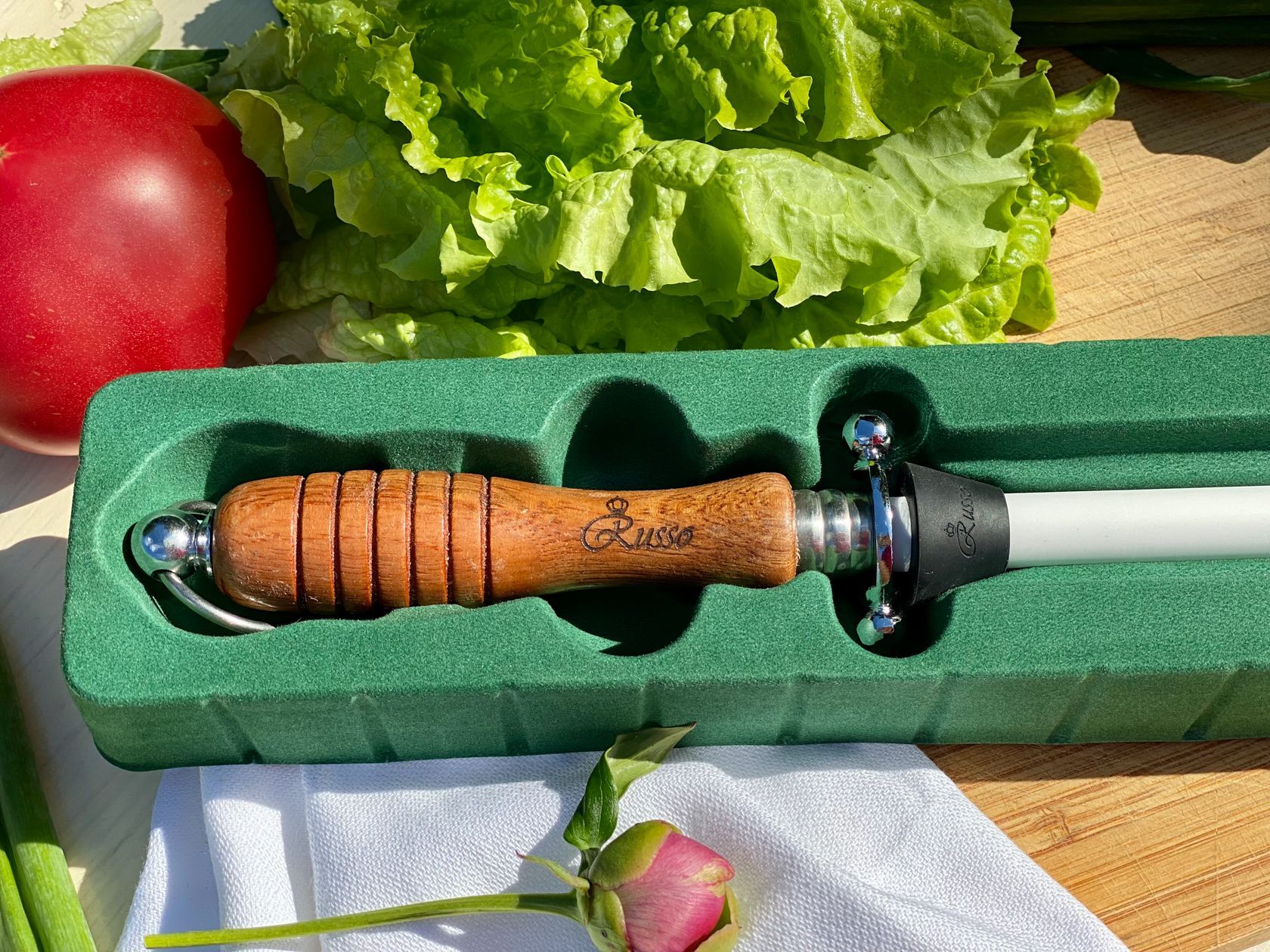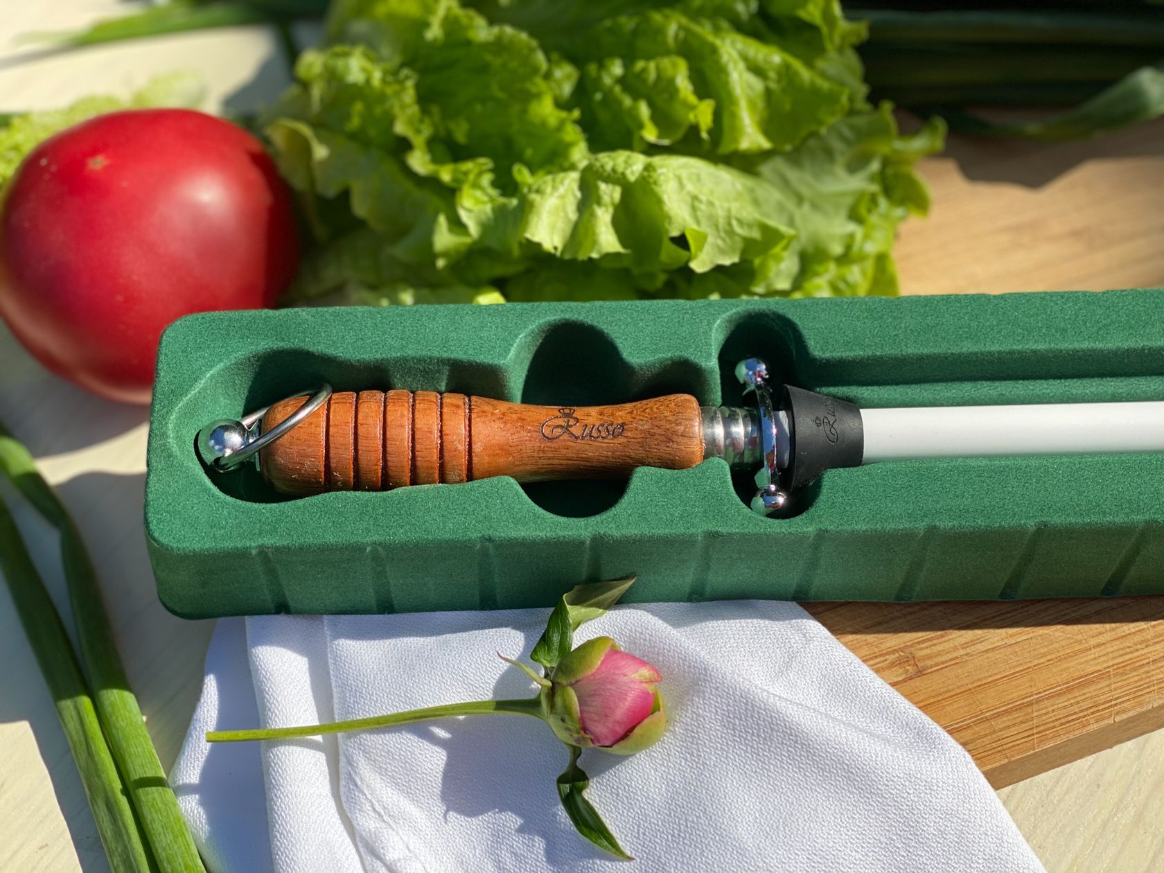 Профессиональный керамический мусат ALEX-CER в несколько движений вернет бритвенную остроту вашему ножу. Керамика зернистостью 1000 grit мягко стачивает заусенец оставляя режущую кромку идеально ровной. Благодаря большой рабочей длине 245мм, заточка происходит быстро и комфортно. ALEX-CER подойдет для сталей любой твердости и для всех видов кухонных ножей. Работа с этим мусатом не требует специального навыка. Правильный угол вам поможет задать направляющая, которая поставляется в комплекте. Элегантная рукоять из натурального дерева обеспечивает уверенный хват, а стальная гарда надежно защищает от острого лезвия. Продукция Russo покрывается пожизненной гарантией от заводских дефектов.