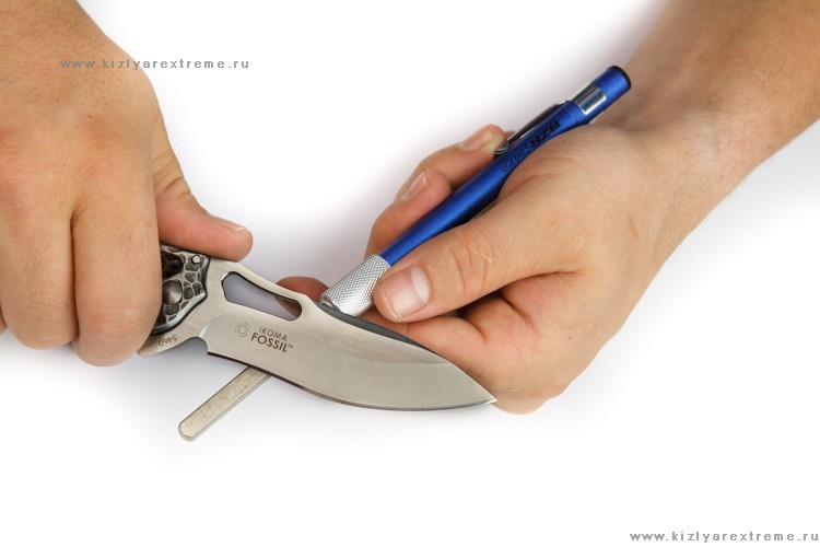 - Удерживая стержень под постоянным углом по отношению к лезвию, с небольшим усилием проведите стержнем вдоль режущей кромки