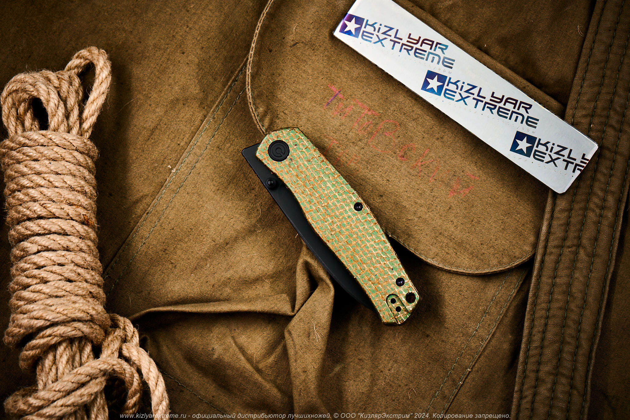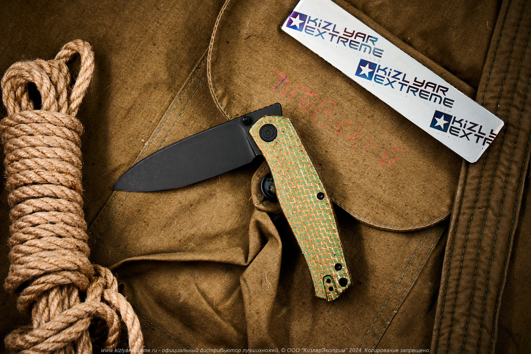 Рукоять ножа изготовлена из микарты - современного композитного материала, состоящего из ткани и эпоксидных смол. Этот материал обладает слоистой структурой, обеспечивающей высокую прочность при небольшом весе. Микарта отличается устойчивостью к воздействию влаги, не впитывает посторонние запахи и сохраняет стабильность при температурных колебаниях. Тактильно приятная поверхность с декоративным рисунком дополняет преимущества этого материала. Эргономичная слегка изогнутая форма обеспечивает комфортный хват, а дополнительные элементы в виде темлячного отверстия и двусторонней клипсы добавляют удобства при эксплуатации.