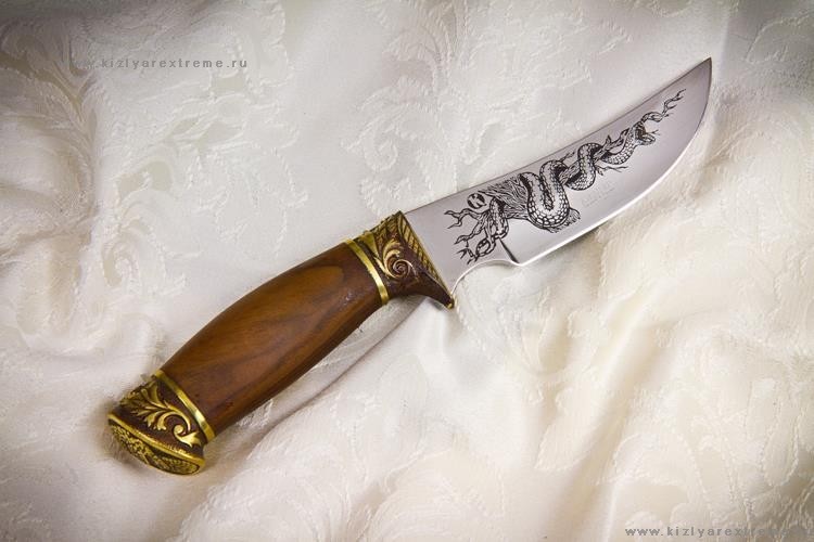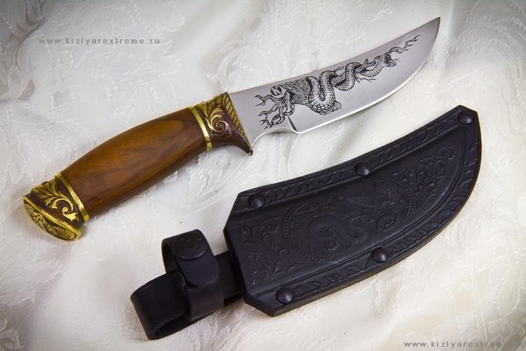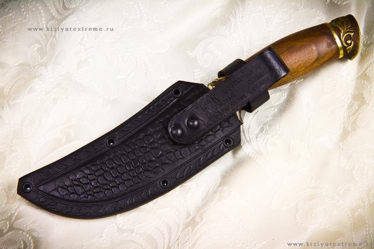 Гюрза-2 с искусно украшенными гардой и навершием из латуни, очень похожей на золото. Гюрза-2 является одним из первых произведенных ООО ПП Кизляр ножей и всегда был одной из самых популярных моделей благодаря своей необычной конструкции и функциональным качествам. Теперь Гюрза-2 предлагается в благородно украшенном виде.