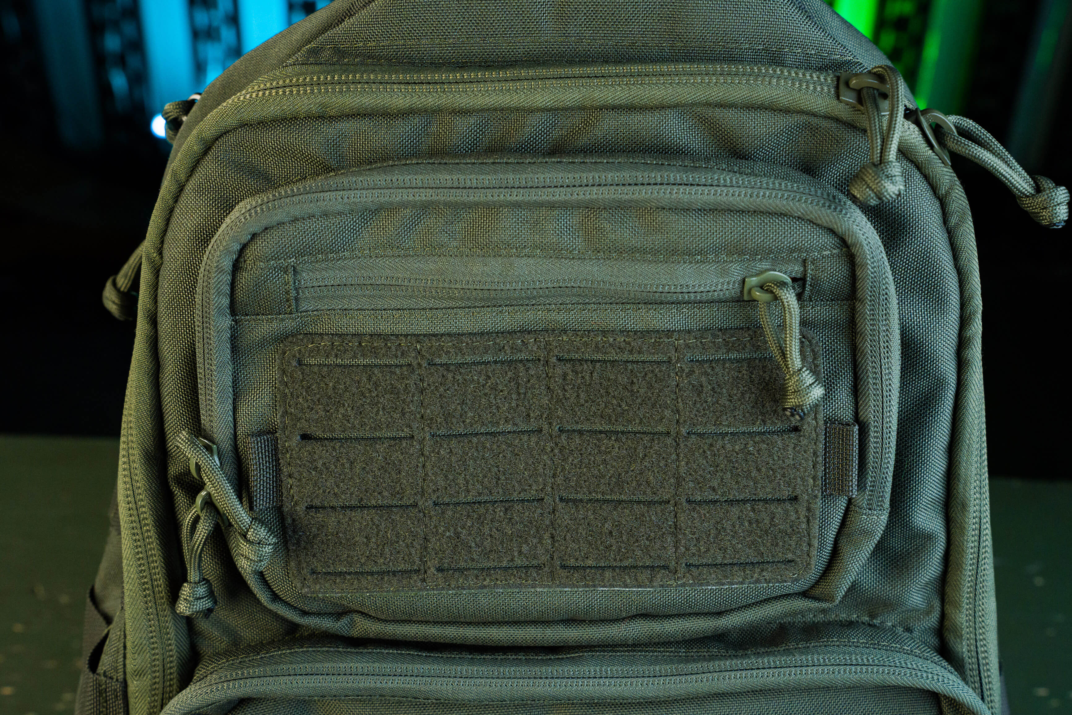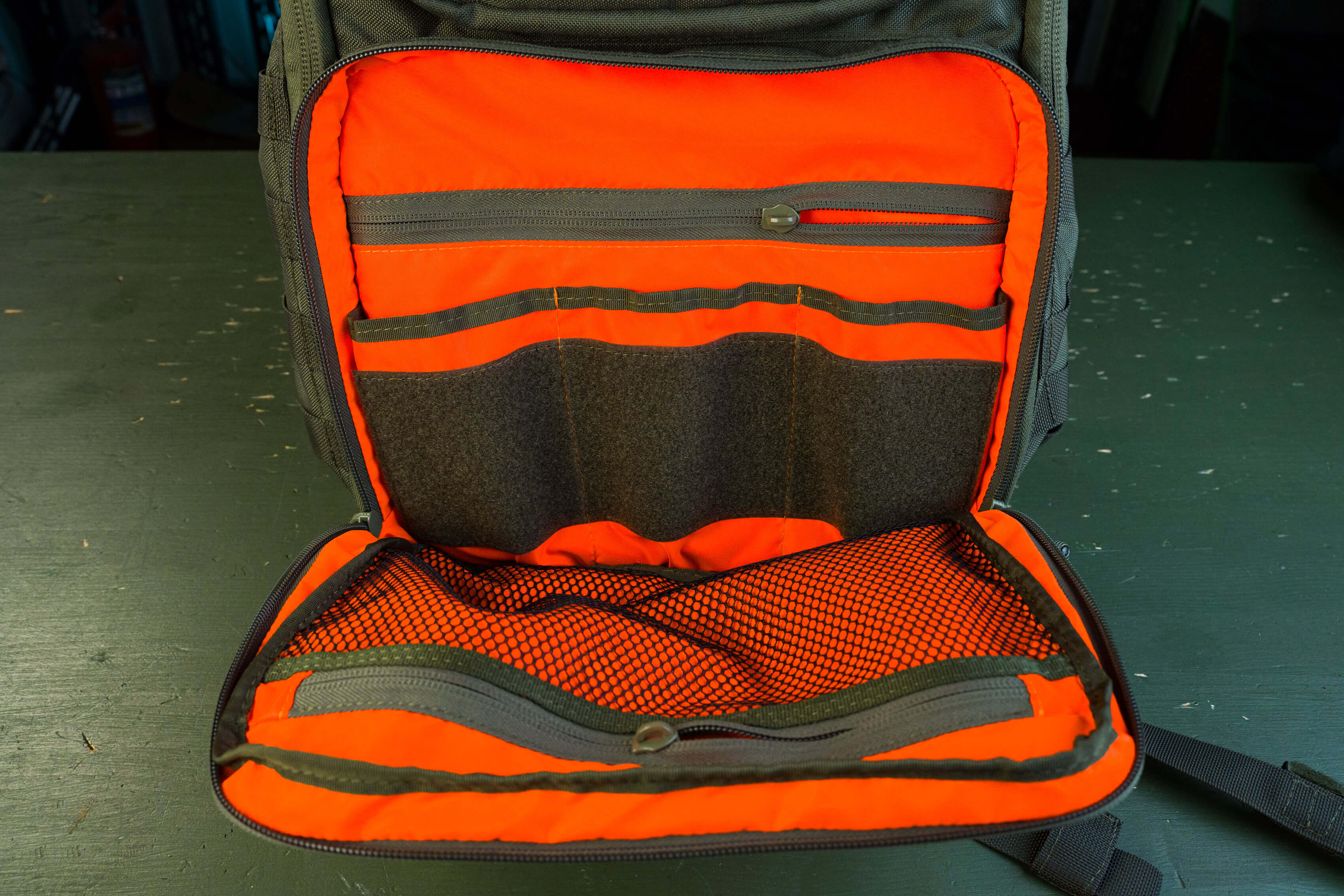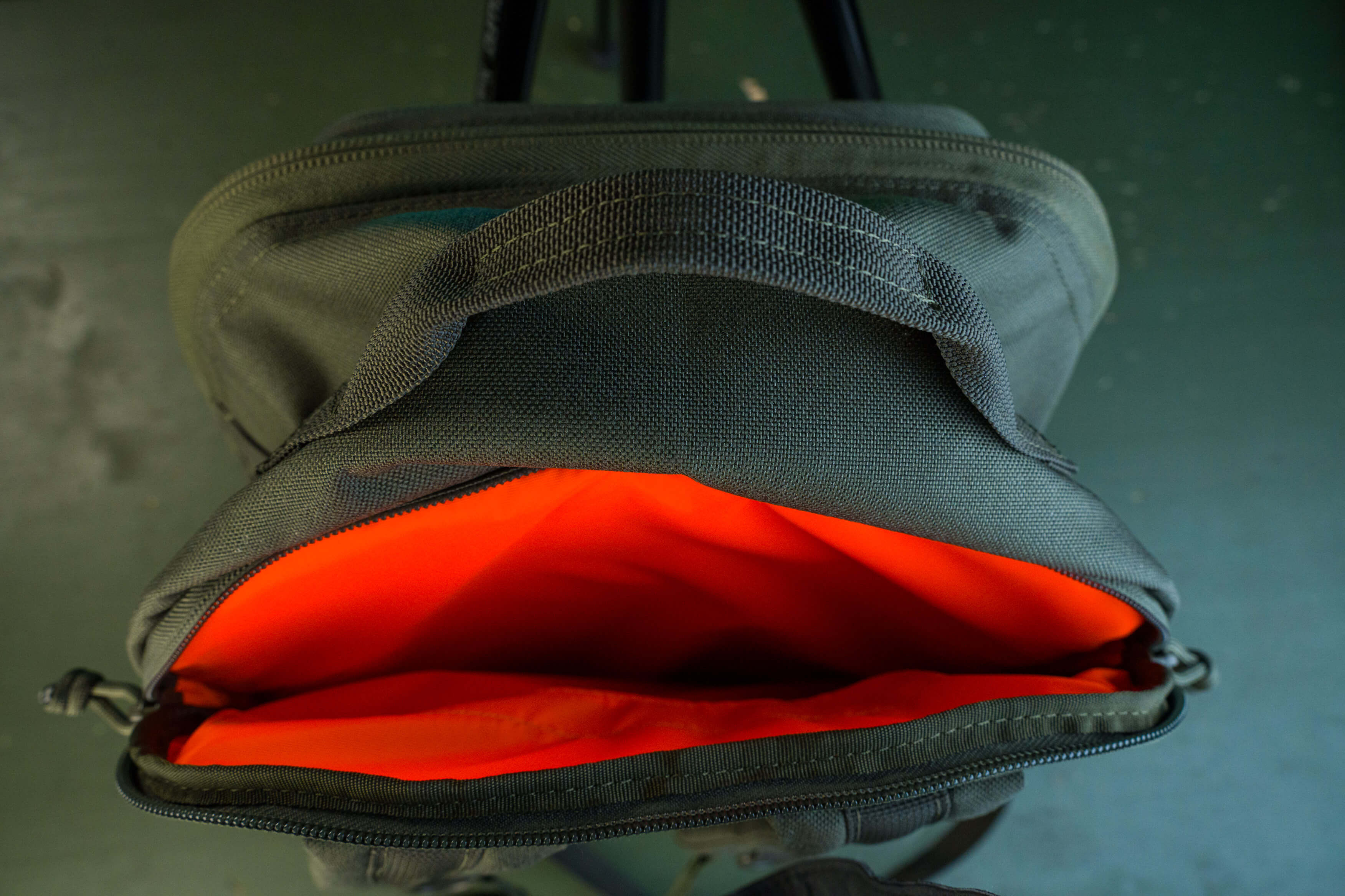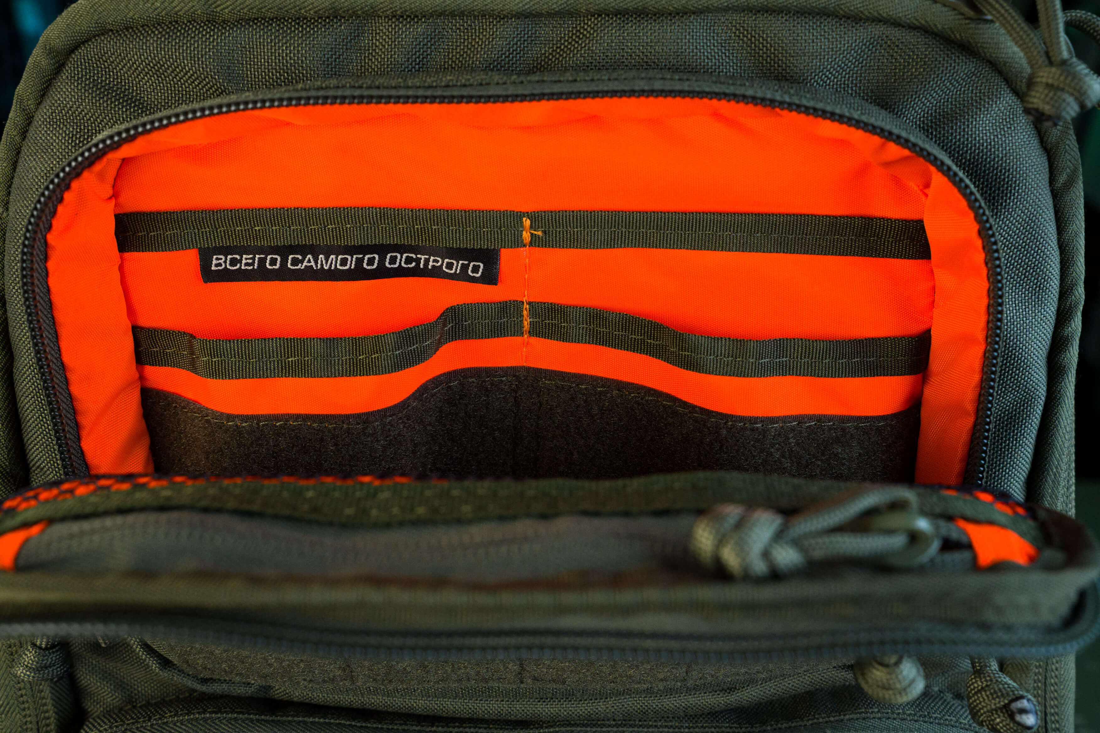 Снаружи два кармана органайзера: верхний небольшой с выделенными секциями под небольшие предметы и нижний с большими секциями под что-то более весомое (мультитул, внешняя батарея, ножевая аптечка и т.д.).