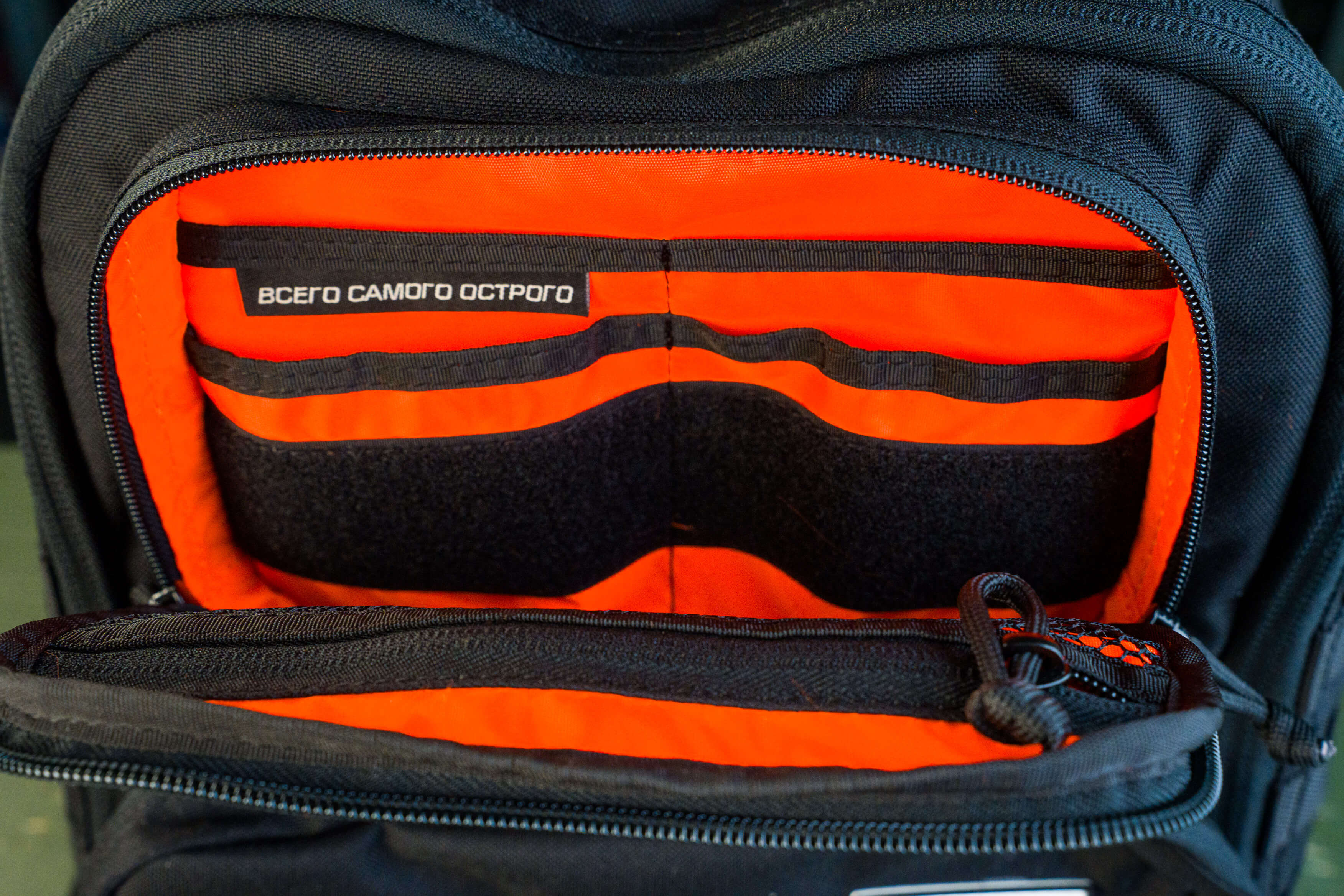 Снаружи два кармана органайзера: верхний небольшой с выделенными секциями под небольшие предметы и нижний с большими секциями под что-то более весомое (мультитул, внешняя батарея, ножевая аптечка и т.д.).