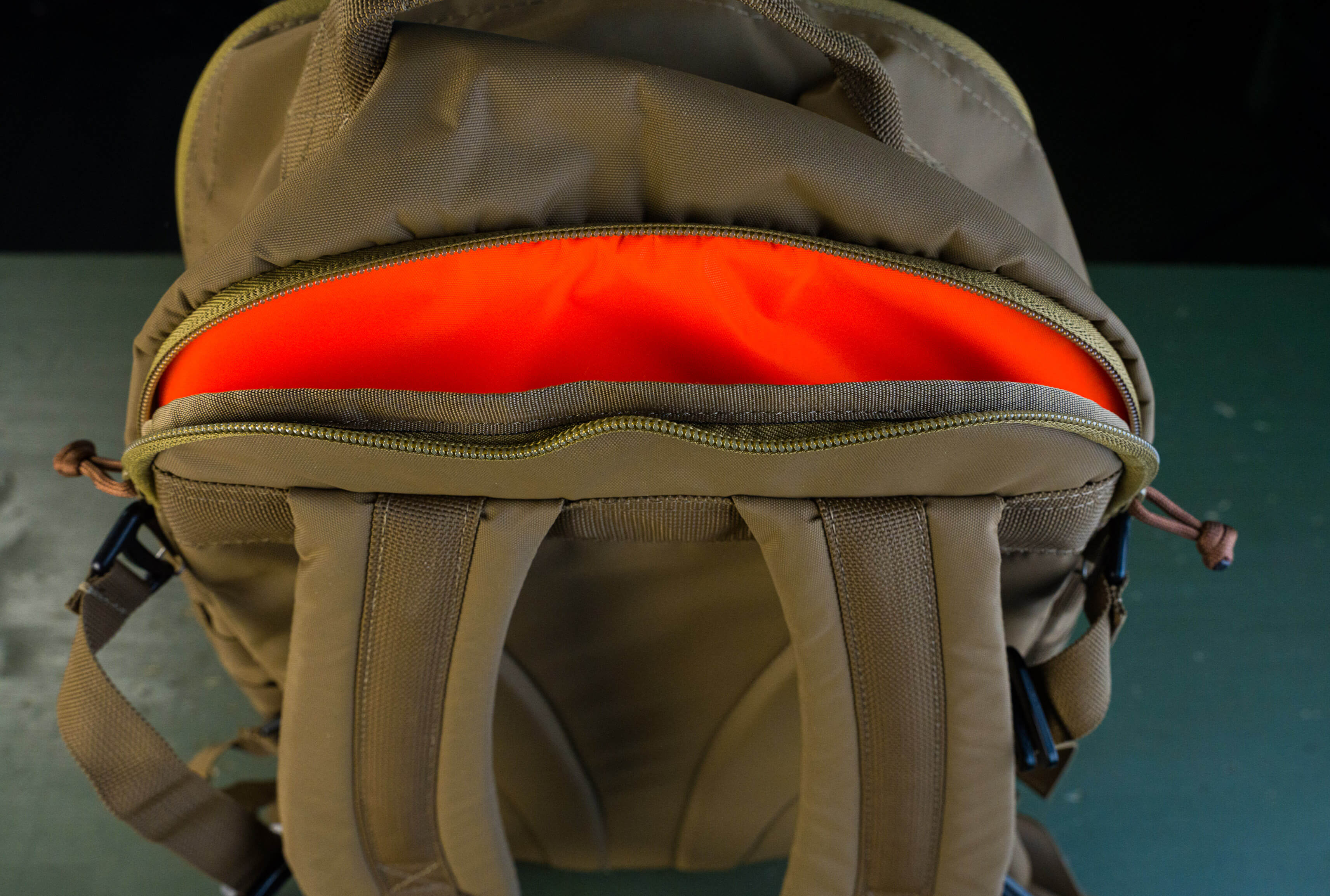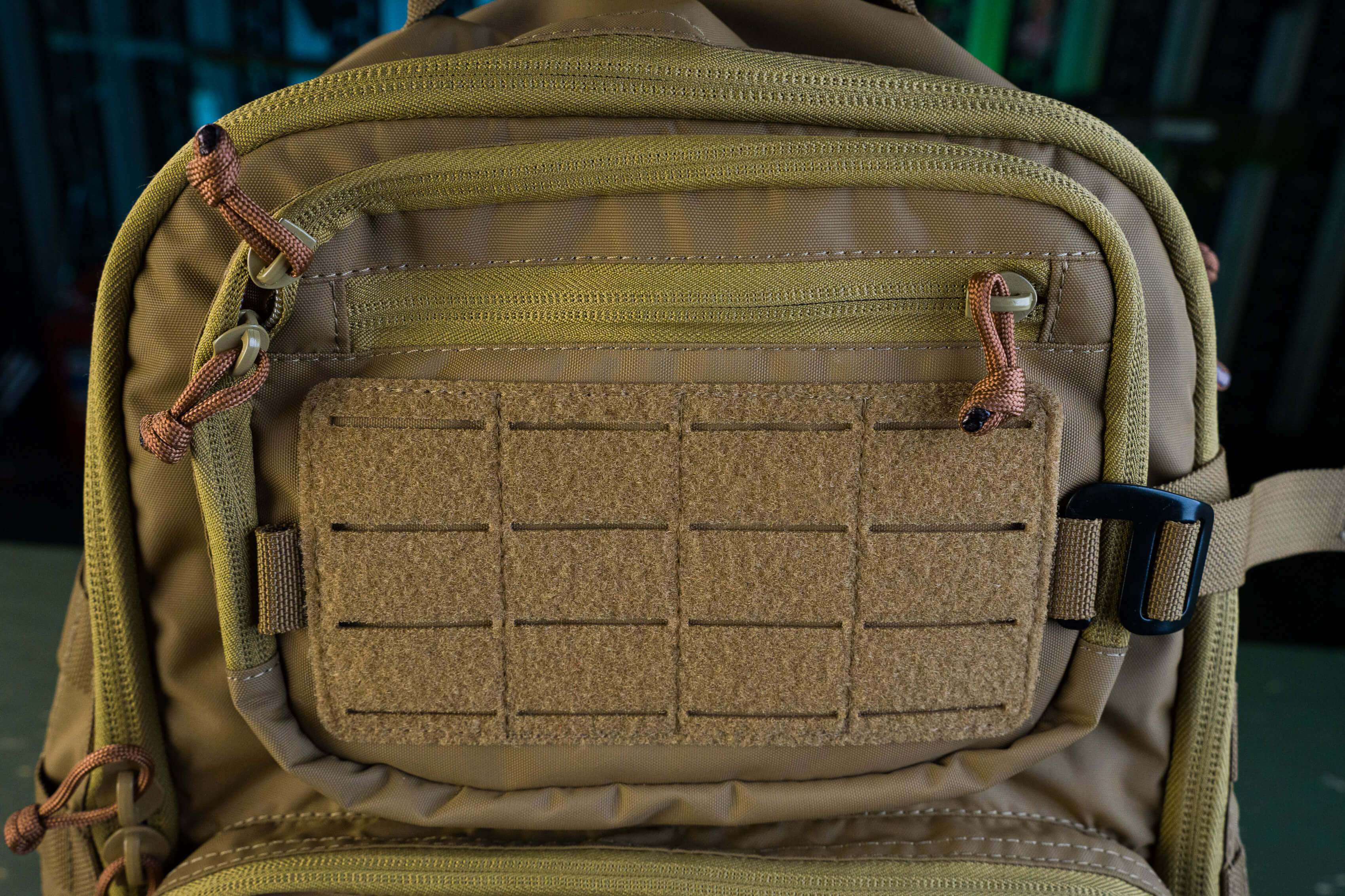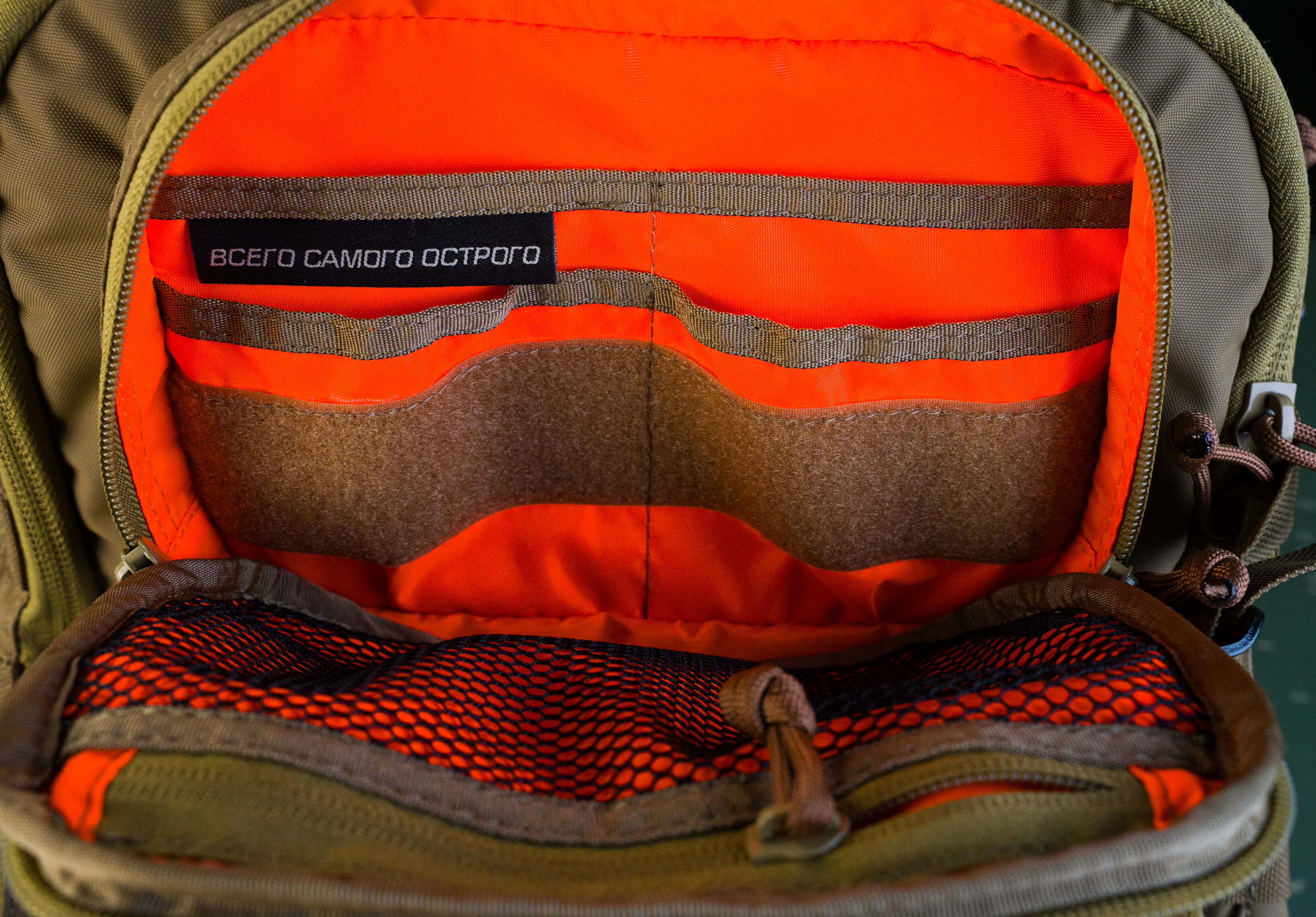 Снаружи два кармана органайзера: верхний небольшой с выделенными секциями под небольшие предметы и нижний с большими секциями под что-то более весомое (мультитул, внешняя батарея, ножевая аптечка и т.д.).