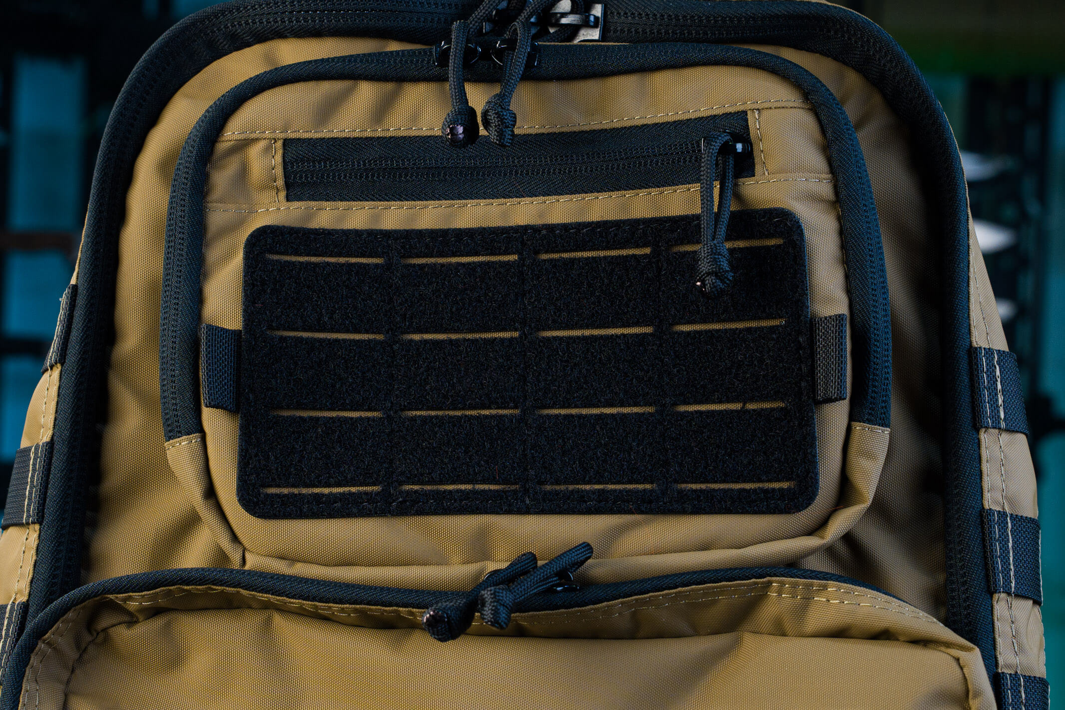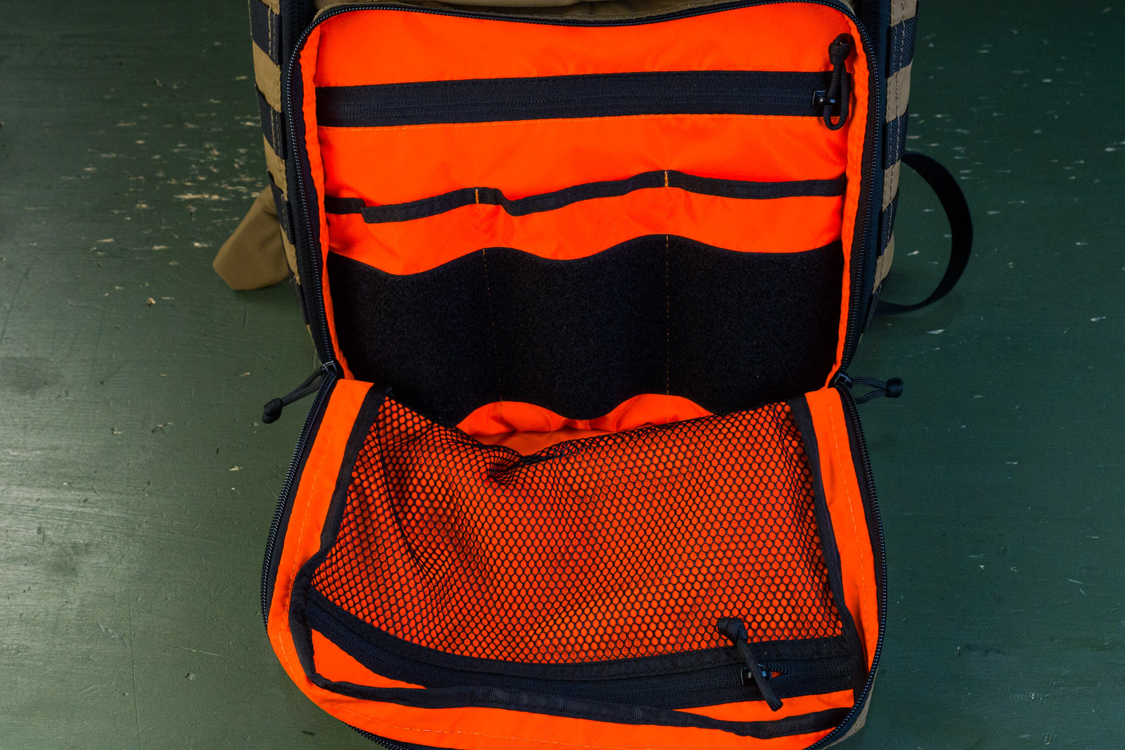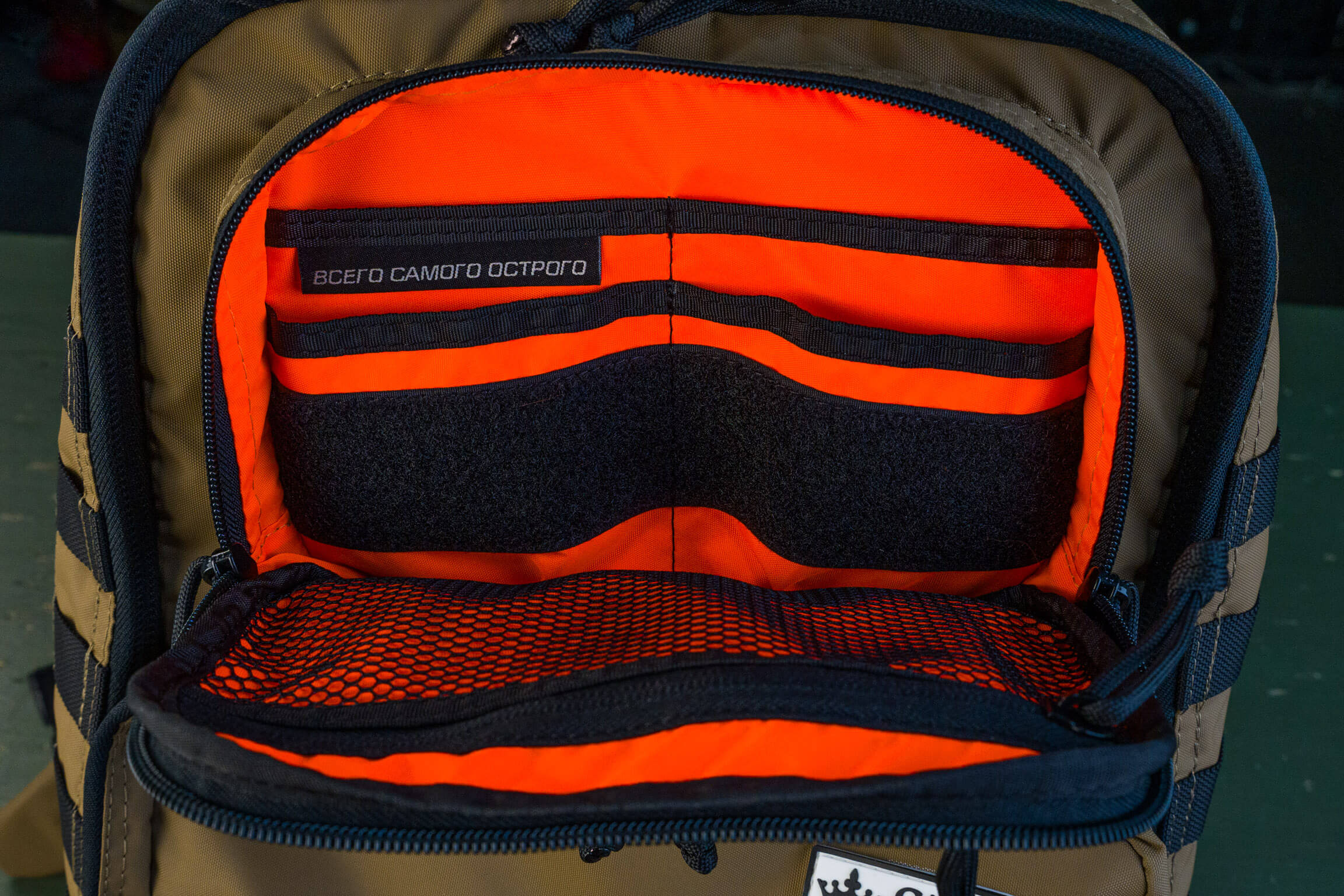 Снаружи два кармана органайзера: верхний небольшой с выделенными секциями под небольшие предметы и нижний с большими секциями под что-то более весомое (мультитул, внешняя батарея, ножевая аптечка и т.д.).