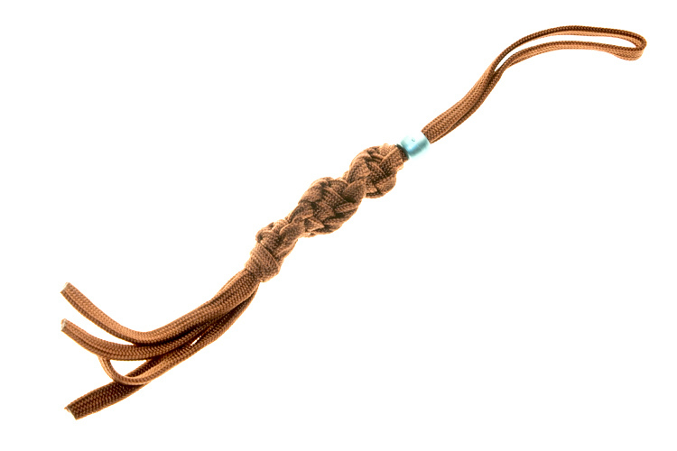 Красивый темляк из паракорда примерной длиной сплетенного участка 5,5-6,5 см и диаметром/шириной сплетенного участка около 7.5 мм, ширина полосы примерно 5 мм.