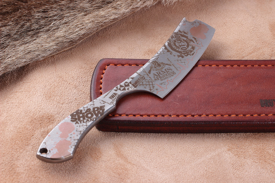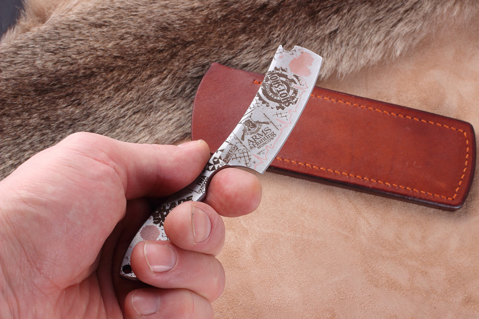 Нож выполнен в форм-факторе, который сочетает в себе элементы опасной бритвы и рабочего ножа.
