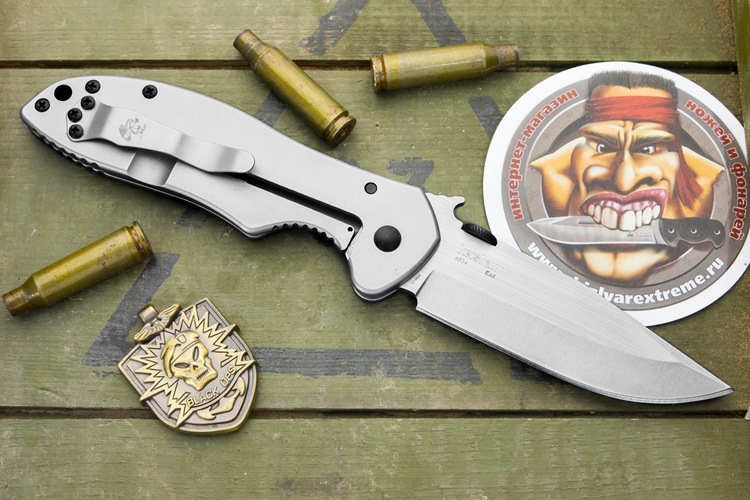 Другая часть полностью стальная, в ней располагается надежный замок Frame Lock. На обухе ножа в области осевого винта расположен вэйв. Это запатентованная система ускоренного ручного открытия от компании Эмерсон. Суть ускоренного открытия состоит в следующем.