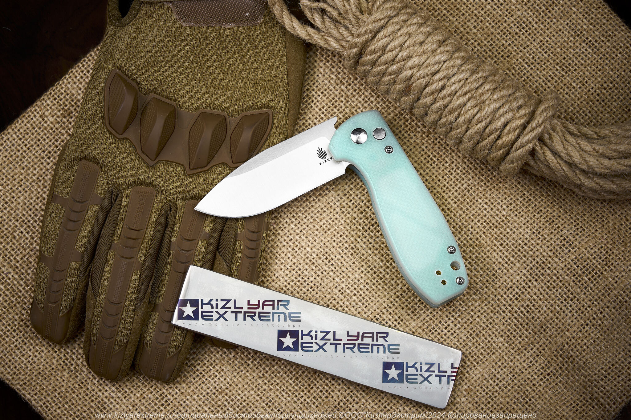 Рукоять изготовлена из прочного материала G10, который устойчив к внешним воздействиям, таким как удары, вода и высокая температура. Она имеет удобную форму с углублением для пальца и упором, образующимся при раскрытии флиппера. Для удобства ношения предусмотрена двухпозиционная клипса и отверстие для темляка.