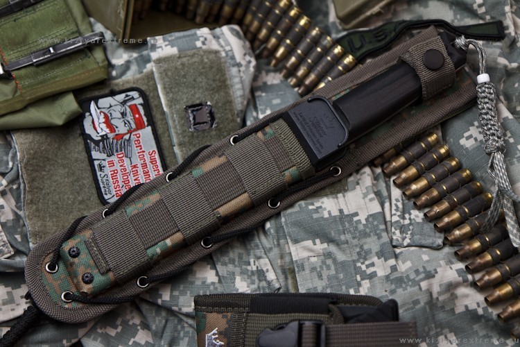Ножи комплектуются ножнами, адаптированными под систему крепления MOLLE. При проектировании ножен учитывался ряд требований, чтобы соответствовать жестким стандартам НАТО: нож должен быть бесшумен при ношении, вставляться в ножны любой стороной, надежно фиксироваться не менее чем двумя точками крепления. В результате получились многофункциональные ножны, с возможностью ношения ножа рукоятью вверх, либо рукоятью вниз, удобно размещаемые на поясе или элементах разгрузочной системы. Также продев ремешок в нижнюю полоску MOLLE с задней стороны, чехол может дополнительно быть закреплен на бедро.
