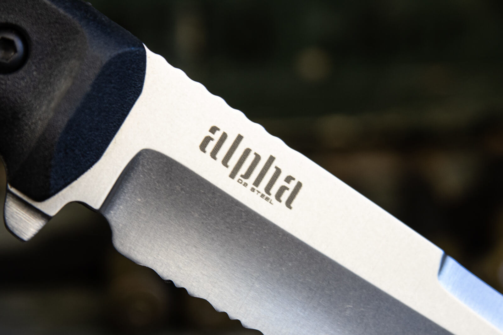 Alpha – клинок сужающейся к острию формы, обладает великолепной проникающей способностью. Часть обуха имеет дополнительную заточку для перерубания проволоки, вскрывания цинков с патронами и других задач. Материал клинка - популярная в США высококлассная сталь D2 твердостью 60-62 HRC обладает великолепной износостойкостью режущей кромки и хорошей коррозионной стойкостью.