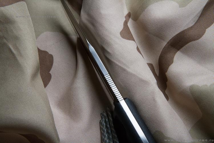 Aggressor – клинок в форме «танто», имеет дополнительную рубящую заточку на обухе, обладает отличной проникающей способностью, мощным острием, прекрасными режущими свойствами.