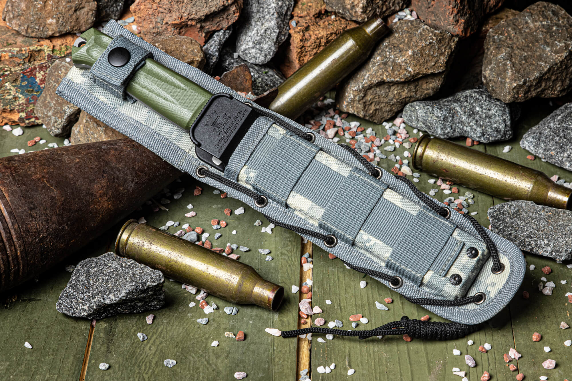 Нож выполнен с учетом российских и натовских армейских стандартов. Его ножны Tactical Echelon совместимы с модульной системой креплений MOLLE, предполагают бесшумное ношение и извлечение ножа. При этом трёхточечная фиксация обеспечивает плотное и надежное удержание ножа внутри даже при ношении рукояткой вниз на разгрузке