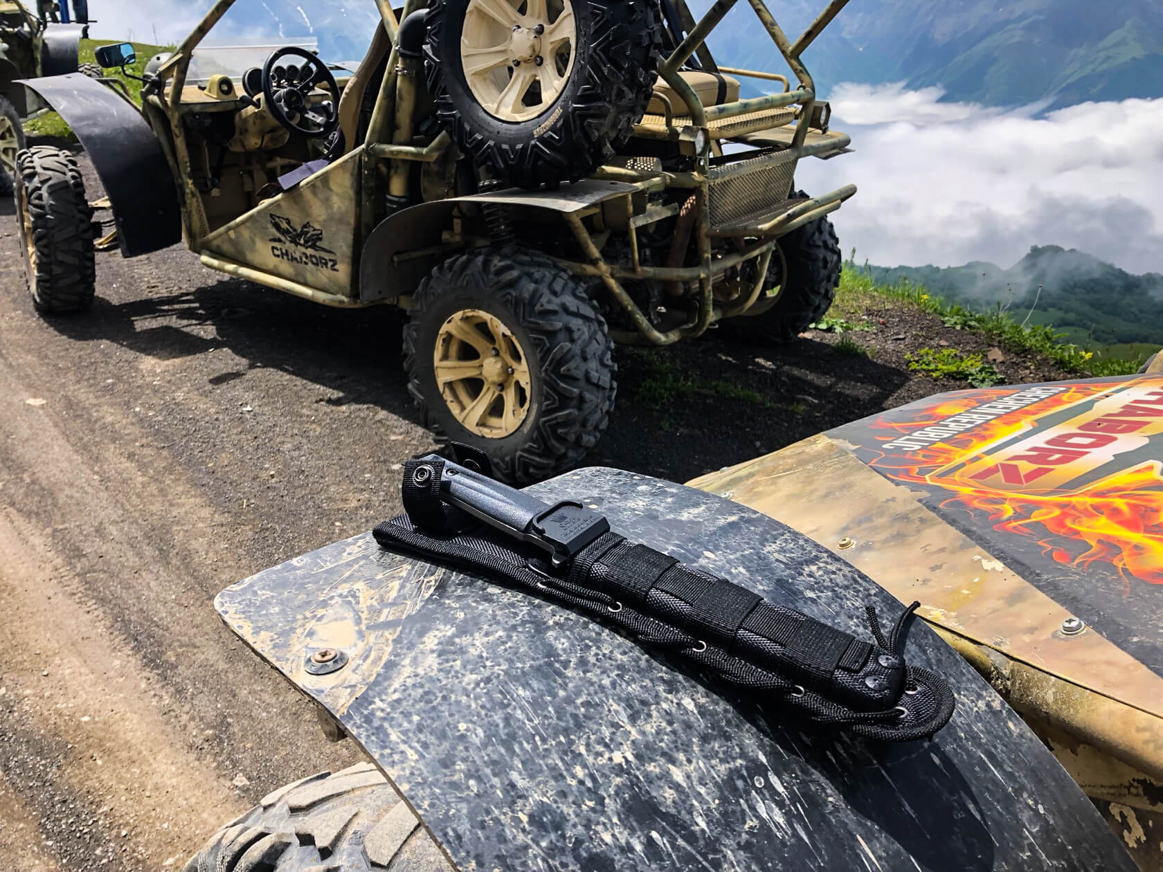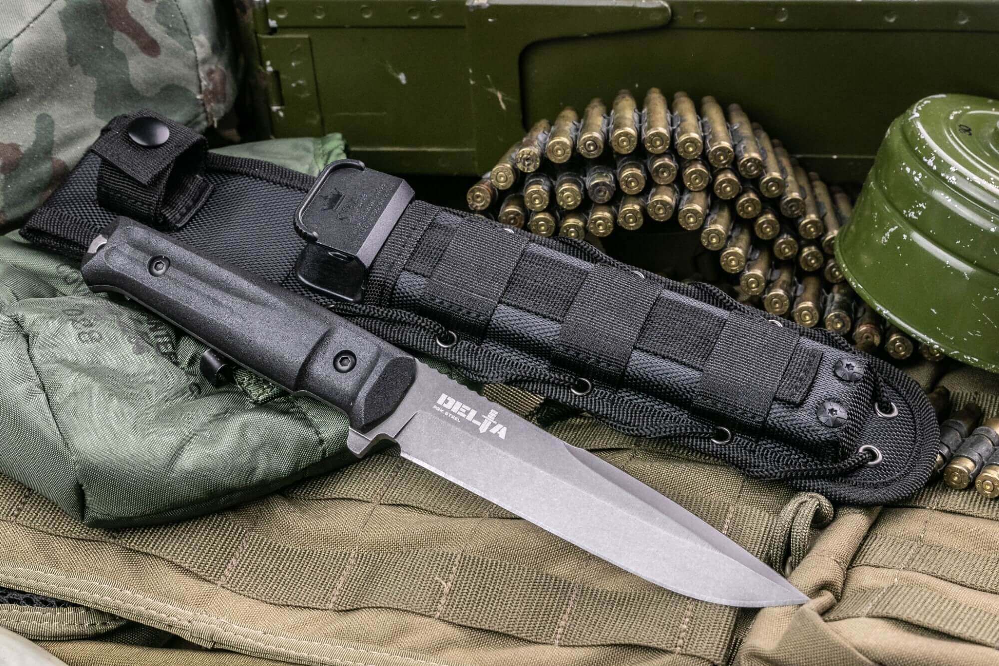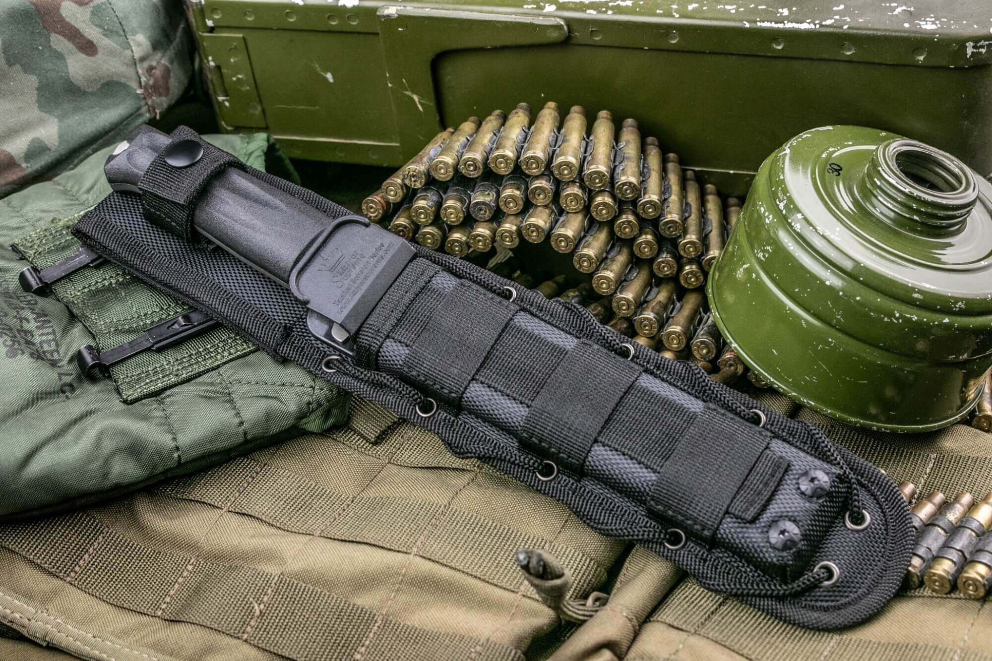 Ножи комплектуются ножнами, адаптированными под систему крепления MOLLE. При проектировании ножен учитывался ряд требований, чтобы соответствовать жестким стандартам НАТО: нож должен быть бесшумен при ношении, вставляться в ножны любой стороной, надежно фиксироваться не менее чем двумя точками крепления. В результате получились многофункциональные ножны, с возможностью ношения ножа рукоятью вверх, либо рукоятью вниз, удобно размещаемые на поясе или элементах разгрузочной системы. Также продев ремешок в нижнюю полоску MOLLE с задней стороны, чехол может дополнительно быть закреплен на бедро.