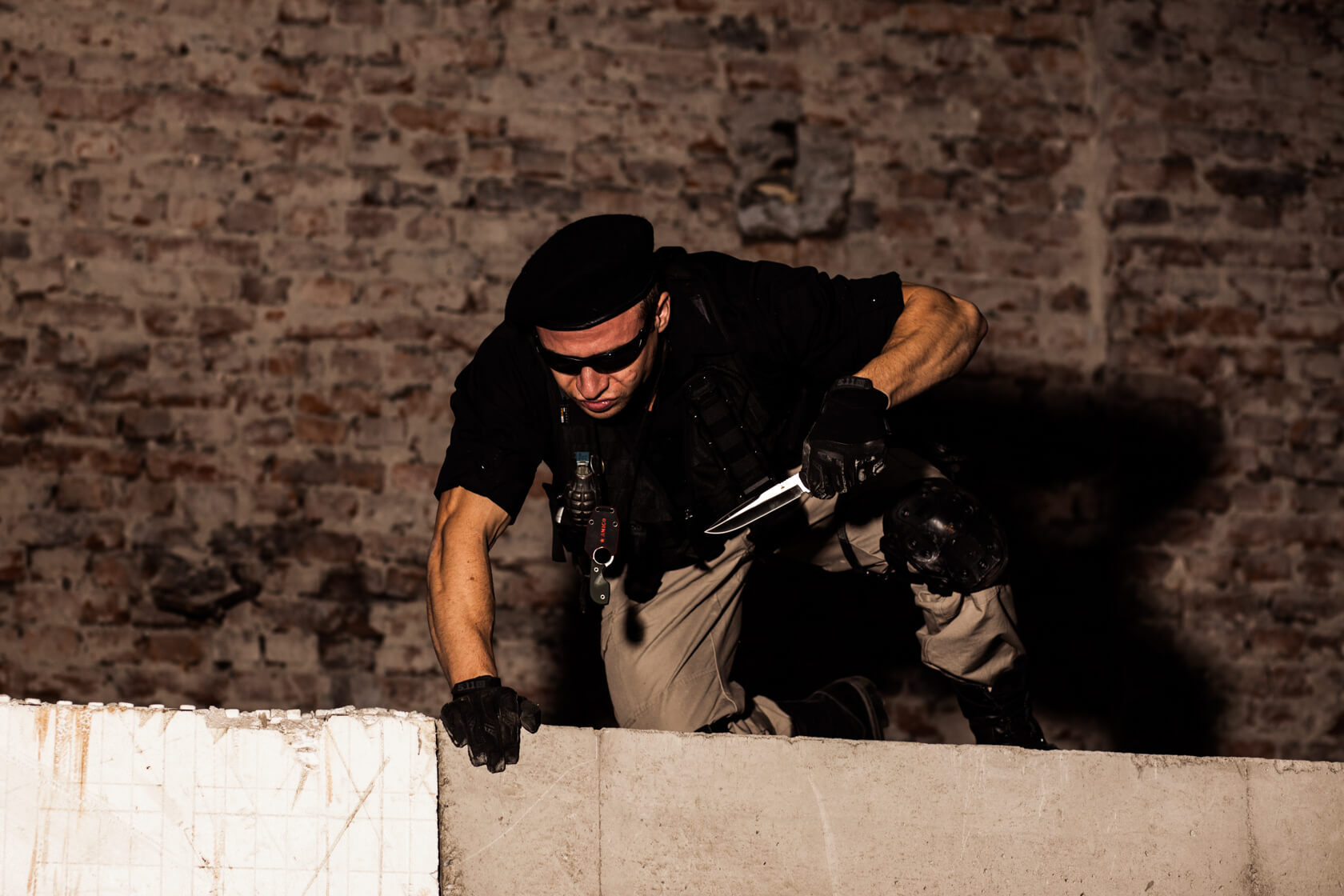 Безопасность при боевом применении ножа обеспечивает форма рукояти. В роли ограничителя использован выступ на пяте клинка и подпальцевая выемка. Вырезы на подпальцевой выемке продлены на боковую поверхность плашек, образуя в устье рукояти подобие гарды.
