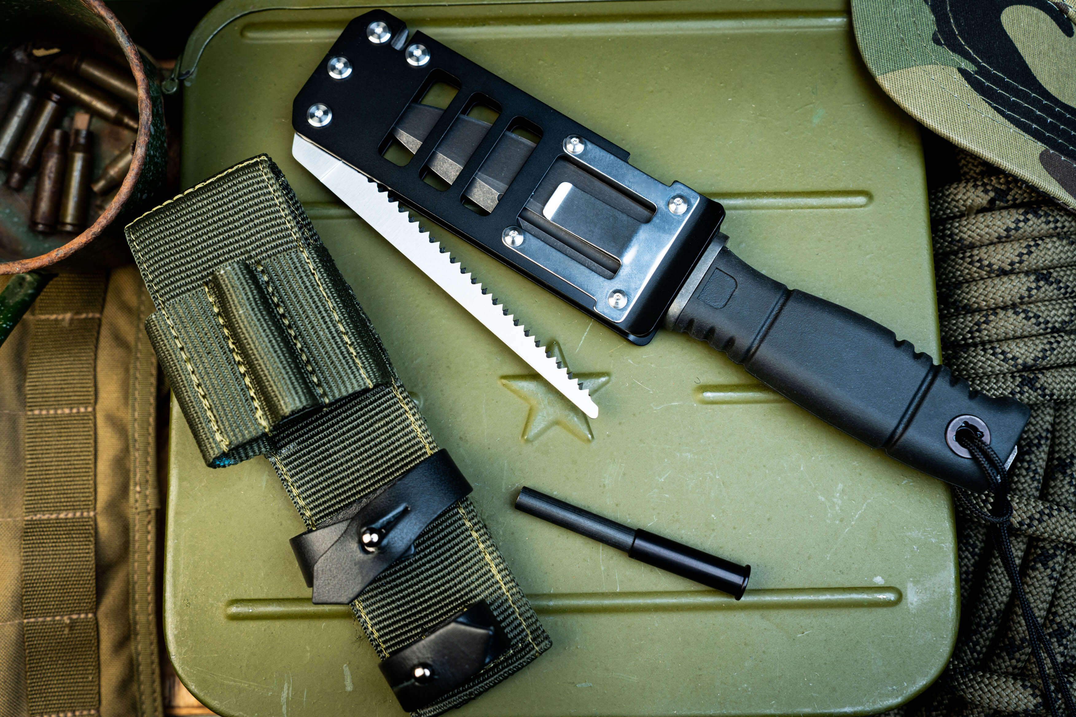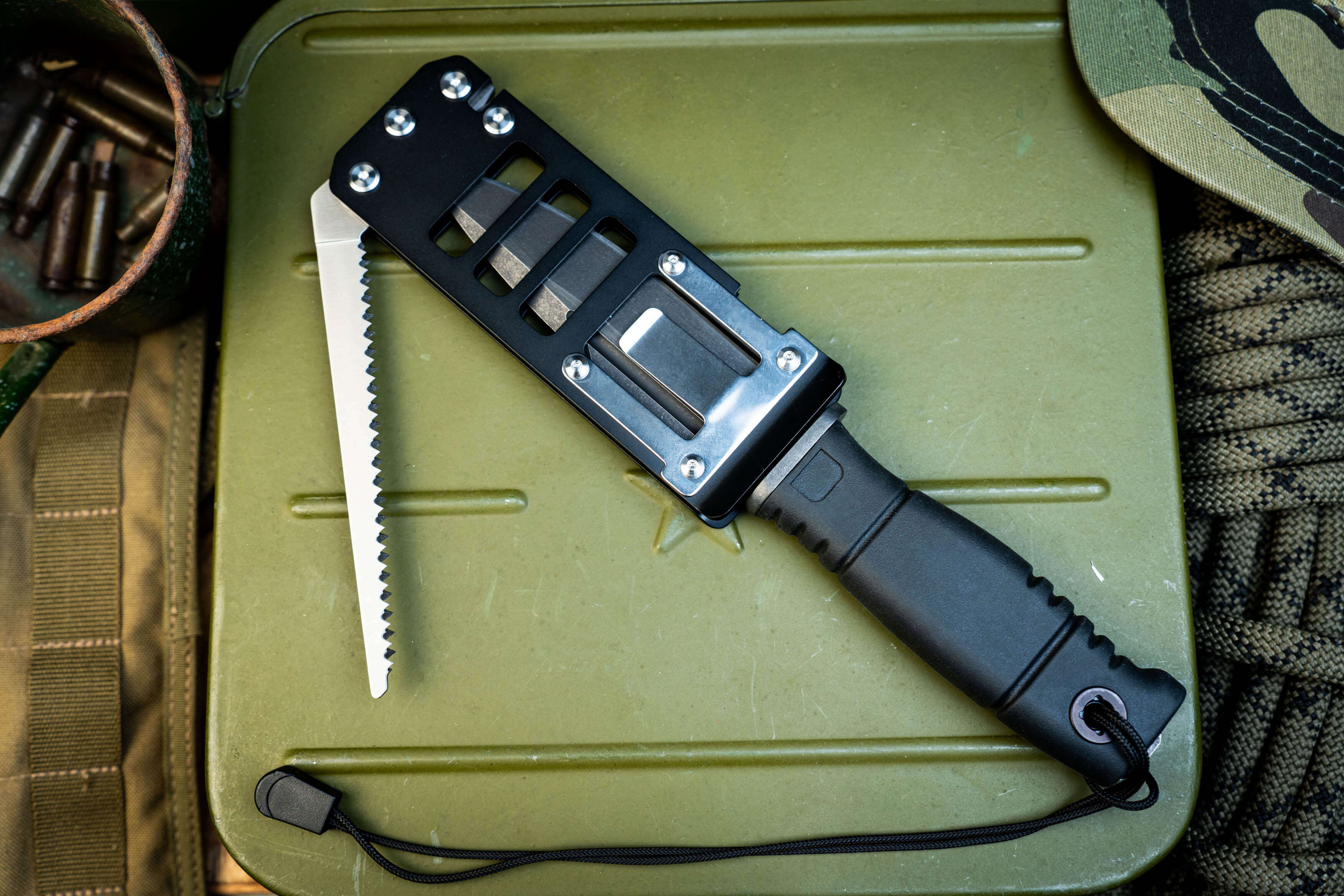 Комплектация: Нож, многофункциональные титановые ножны, складная пила, огниво, заточное устройство, темляк.