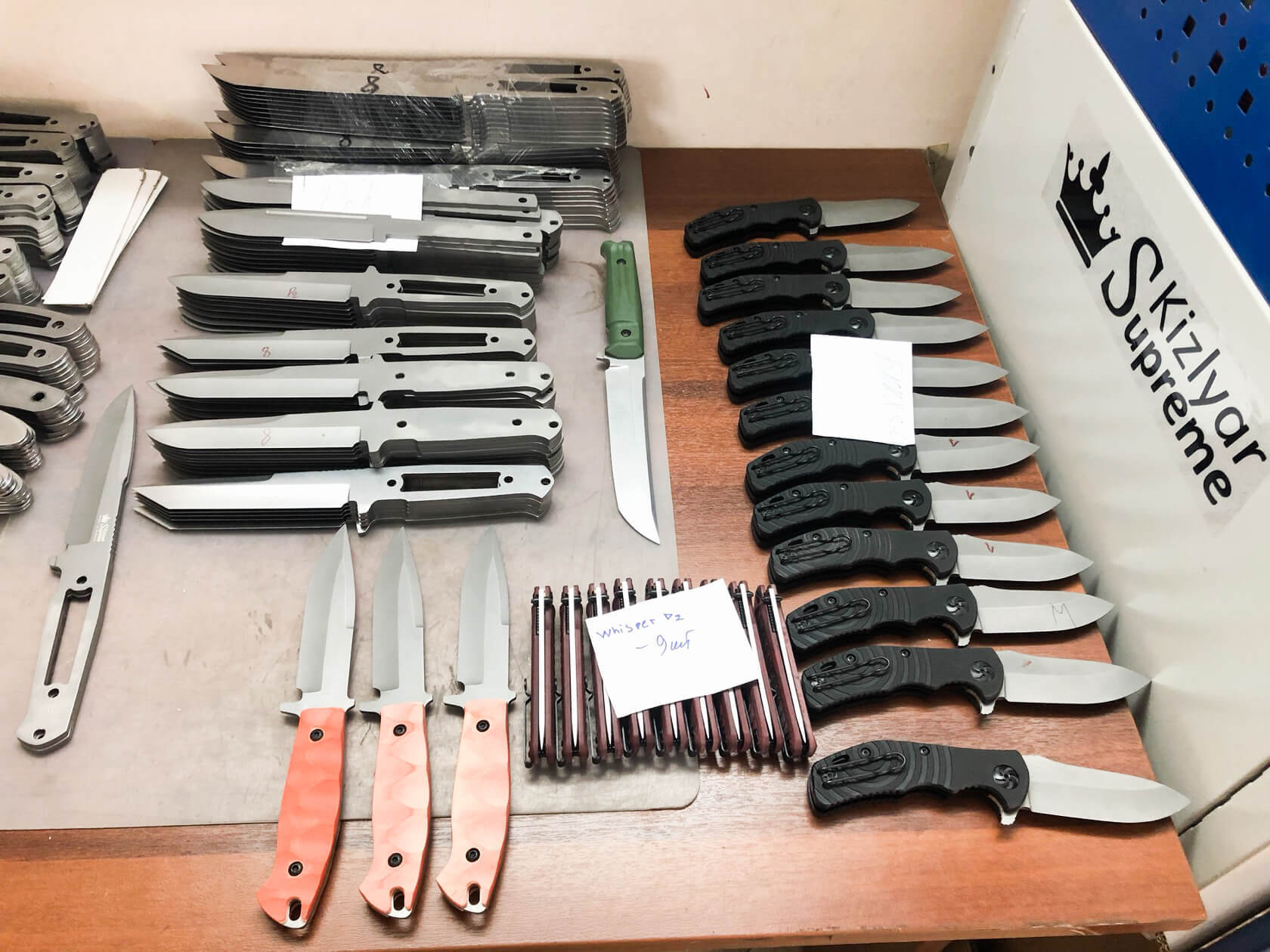 Конструкция ножей простая, но максимально прочная: накладки рукояти, изготовленные из Kraton, известного своей износоустойчивостью к истиранию и повышенными фрикционными качествами, прикручены к цельнометаллическому хвостовику резьбовыми стяжками, а также дополнительно проклеены. Стоит отметить, что рукоять идеально совместима с тактическими перчатками.