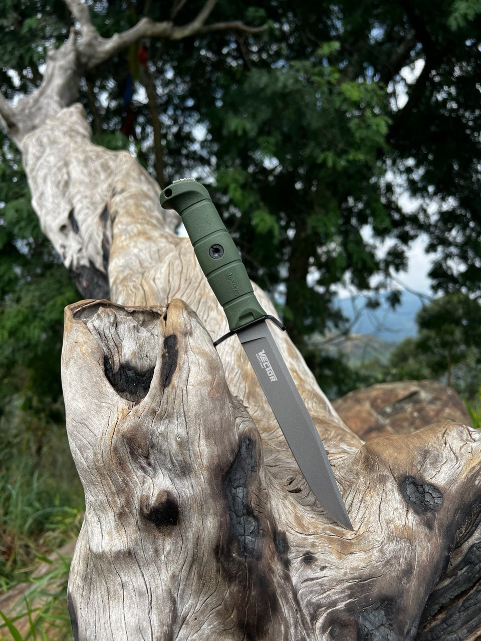 Для компенсации толстого обуха нож оснащен очень широкими спусками, которые составляют более 4/5 клинка. Такие широкие прямые спуски со сравнительно тонким сведением дают ножу, отличный контролируемый рез без всяких компромиссов. Так что упоминание полевой кухни было отнюдь не для красного словца - этот функционал в Векторе тоже продуман.