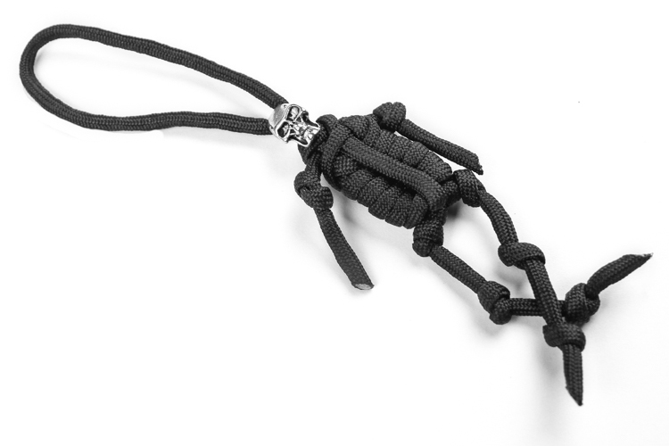 Красивый темляк из паракорда в форме скелета, с бусинкой череп, примерной длиной сплетенного участка 4 см и шириной сплетенного участка около 20 мм, ширина полосы примерно 3 мм.
