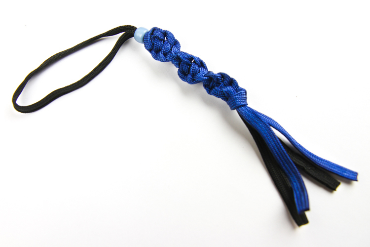 Красивый темляк из паракорда примерной длиной сплетенного участка 5,5-6,5 см и диаметром/шириной сплетенного участка около 7 мм, ширина полосы примерно 5 мм.