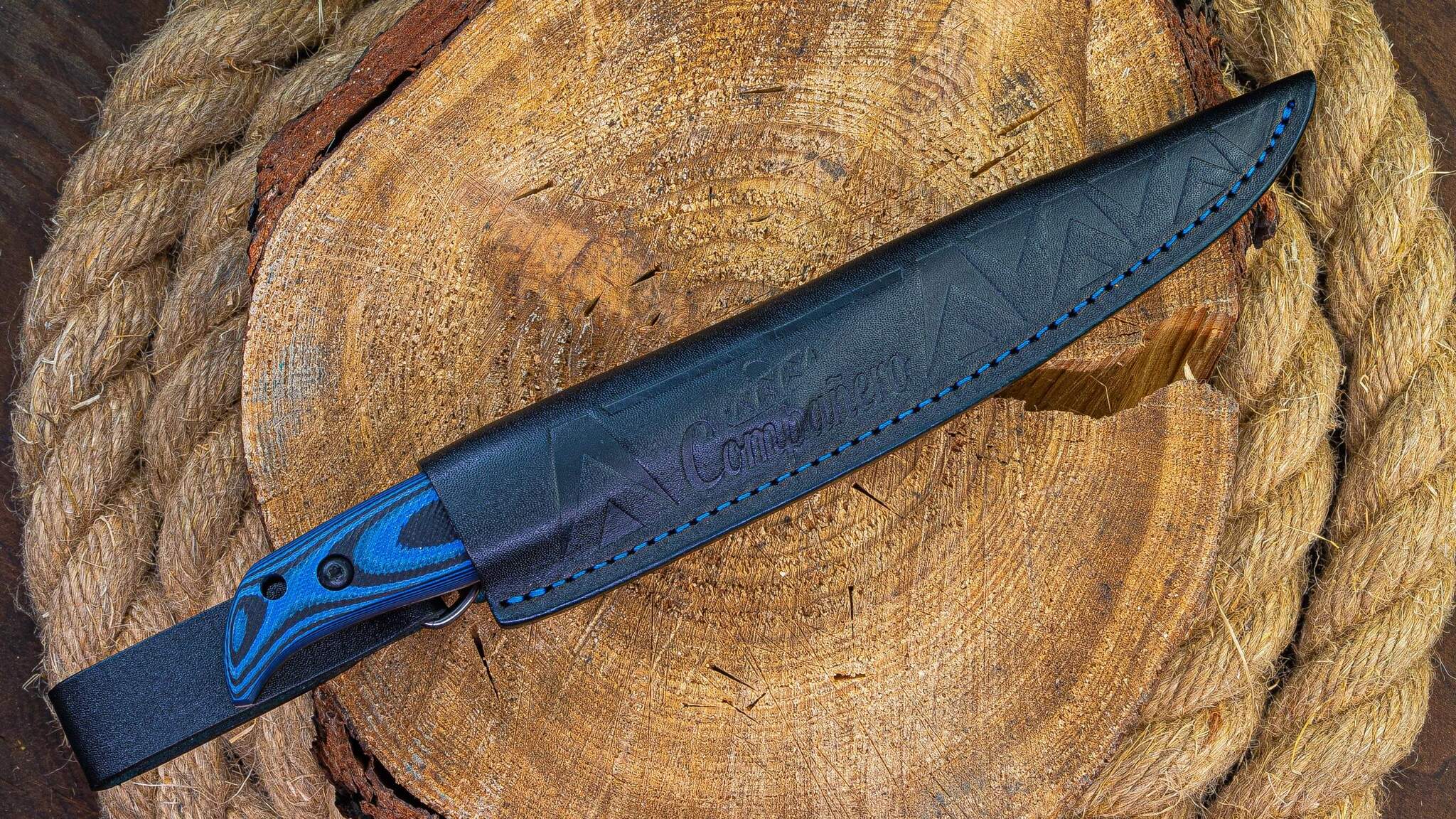 Ножны для Companero погружного типа выполнены из дорогой качественной кожи с красивым тиснением. Они оснащены быстросъёмной петлей свободного подвеса (что редко встречается на кожаных ножнах), а также петлей жесткого подвеса. Ножны компактные, лаконичные и красивые. В их устье находится своеобразная кожаная пружина, образуемая подвесом, которая дает дополнительную плотность посадки ножа. Это специальная разработка наших партнеров-кожевенников, абсолютное новшество в ножевой сфере.