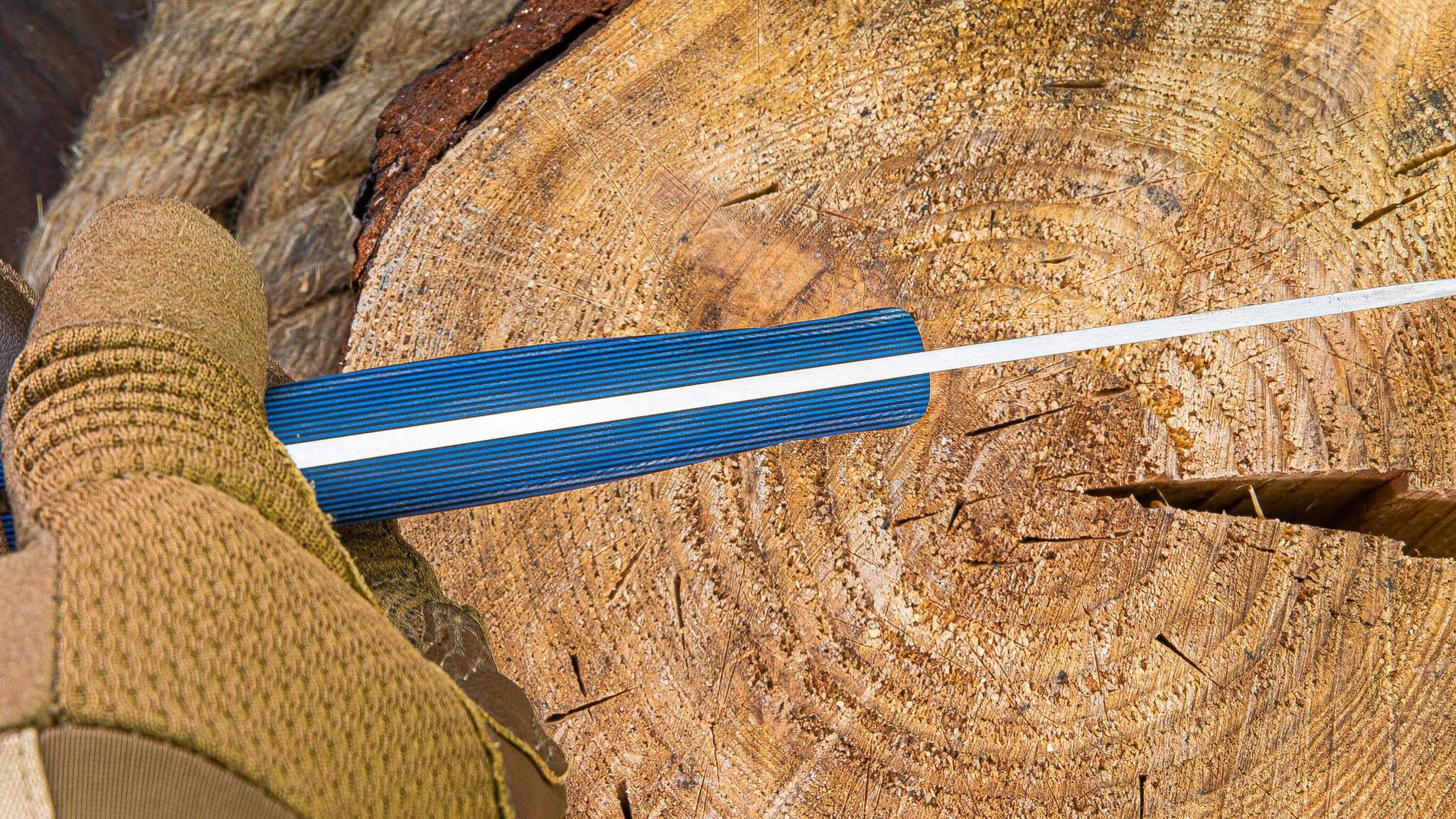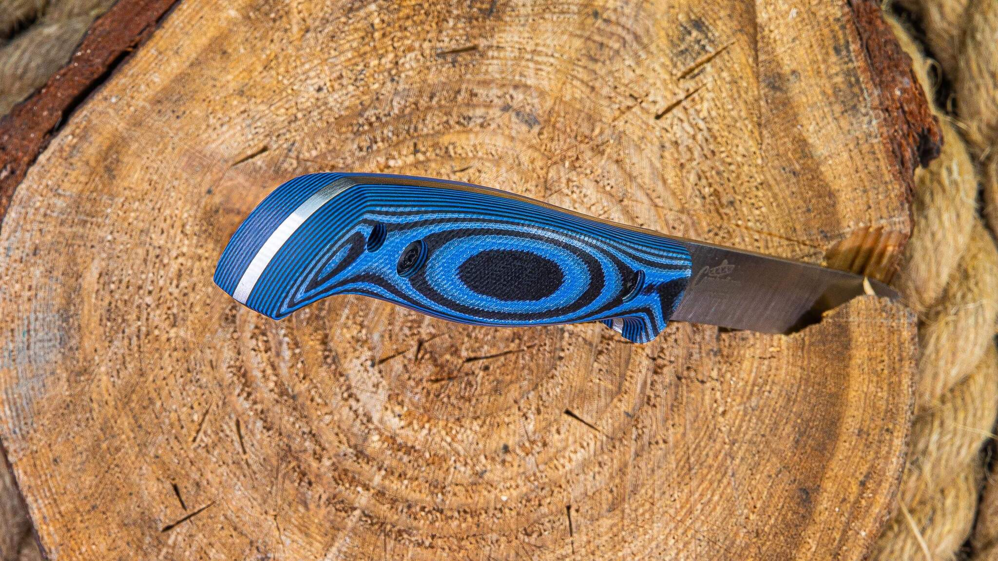 Материал тоже выбран не случайно - это красивый черно-синий G10, с приятной фактурой. Такая обработка рукояти обеспечивает отличную цепкость как при работе голой рукой, так и в перчатке.