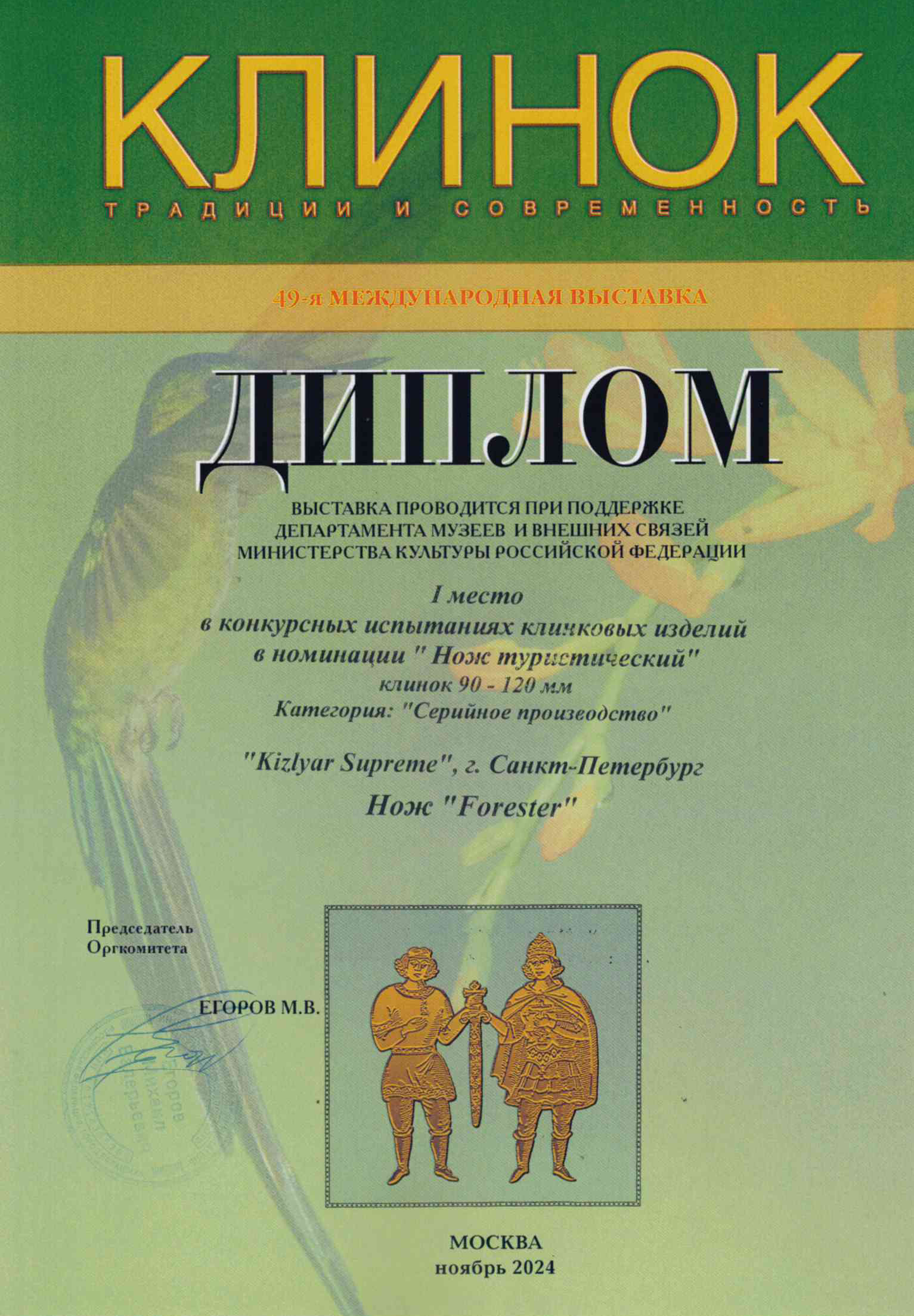 🏆Forester I место в конкурсных испытаниях клинковых изделий в номинации "Нож туристический" клинок 90 - 120 мм.