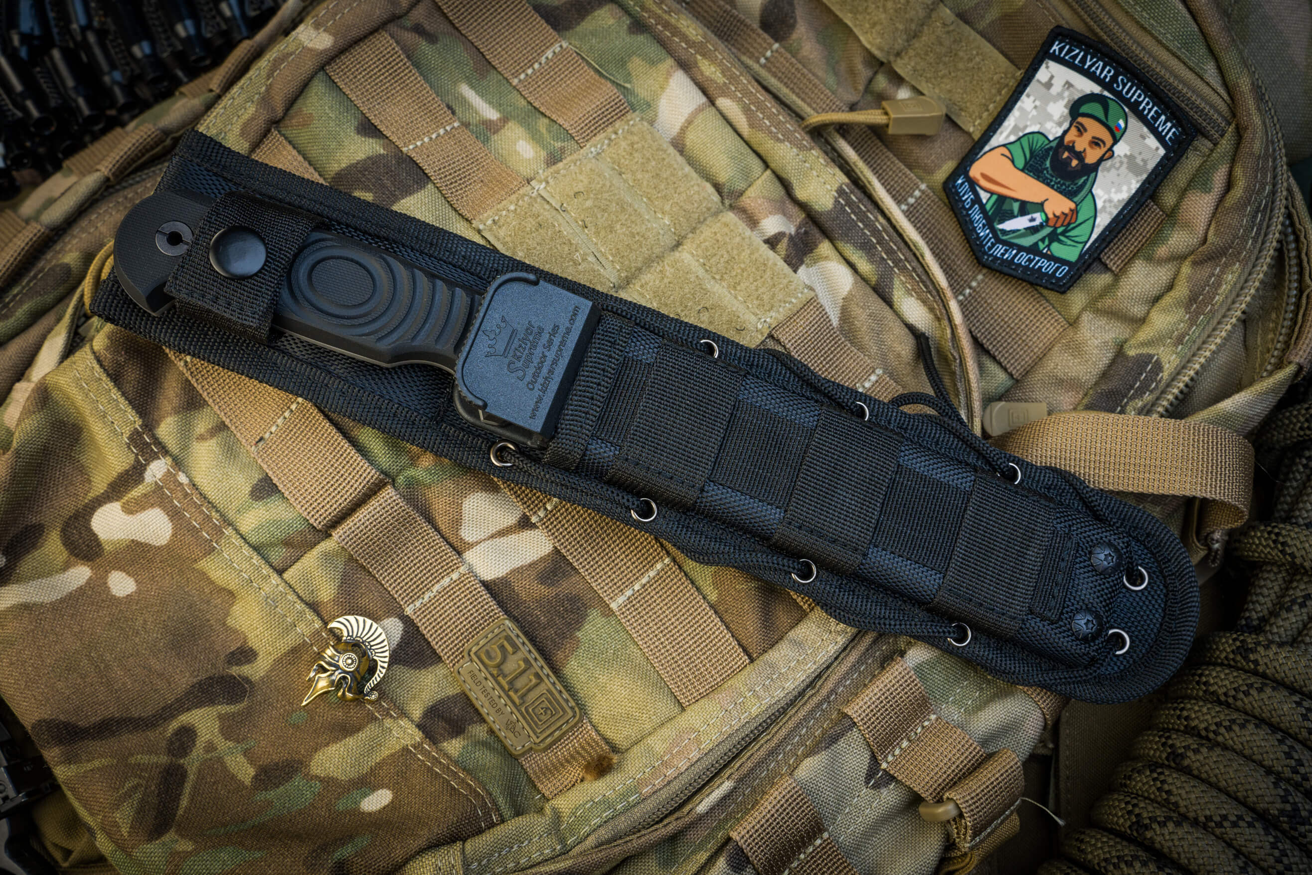 Ножи комплектуются ножнами, адаптированными под систему крепления MOLLE. При проектировании ножен учитывался ряд требований, чтобы соответствовать жестким стандартам НАТО: нож должен быть бесшумен при ношении, вставляться в ножны любой стороной, надежно фиксироваться не менее чем двумя точками крепления. В результате получились многофункциональные ножны, с возможностью ношения ножа рукоятью вверх, либо рукоятью вниз, удобно размещаемые на поясе или элементах разгрузочной системы. Также продев ремешок в нижнюю полоску MOLLE с задней стороны, чехол может дополнительно быть закреплен на бедро.