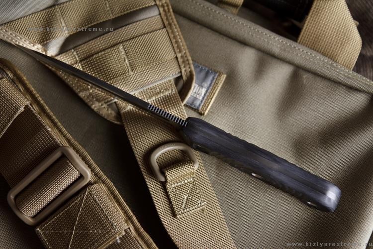 Форма рукояти очень удобна, она достаточно универсальна для ладоней разной антропометрии, имеет надежный ограничитель, предотвращающий возможное соскальзывание руки на лезвие при работе. Расширяющаяся тыльная часть рукояти позволяет надежно удерживать нож при рубящих или секущих ударах. Накладки рукояти текстурированы дугообразными вырезами для лучшего удержания мокрыми или жирными руками. Навершие рукояти имеет закругленную форму, при этом грани накладок тщательно скруглены. Такая форма позволяет комфортно работать хватом с упором ладони в рукоять, если нужно что-нибудь расковырять, поддеть.