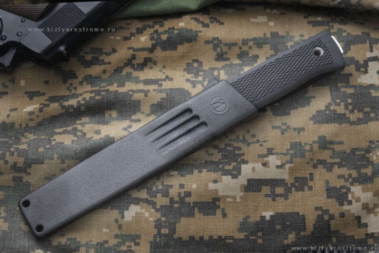 Нож комплектуется ножнами из ударопрочного АБС пластика с подвесом из тропы. Ножны
