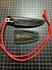 Черные кожаные ножны с красной прострочкой выглядят очень стильно и плотно удерживают нож внутри. При помощи паракорда нож легко крепится к поясу вертикально или горизонтально, или легко превращается в компактный шейник. Все продумано и удобно.