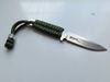 Черные кожаные ножны с красной прострочкой выглядят очень стильно и плотно удерживают нож внутри. При помощи паракорда нож легко крепится к поясу вертикально или горизонтально, или легко превращается в компактный шейник. Все продумано и удобно.