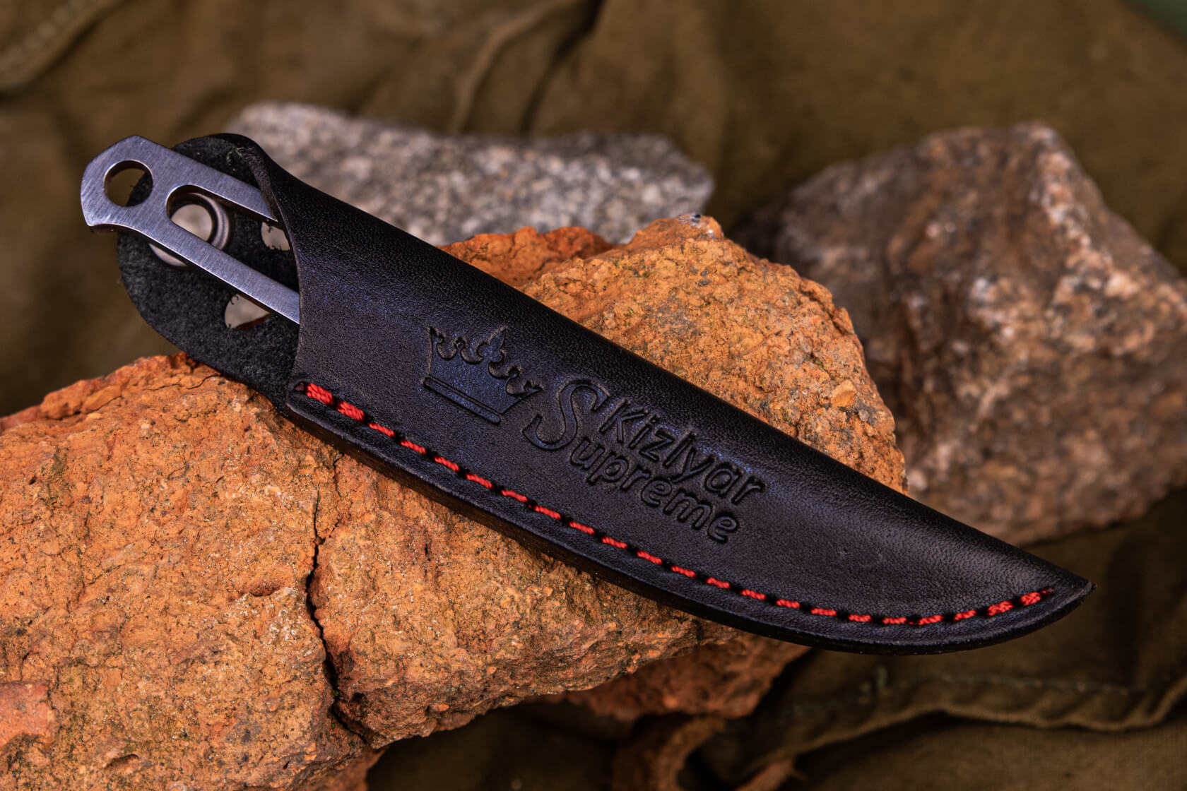 Черные кожаные ножны с красной прострочкой выглядят очень стильно и плотно удерживают нож внутри. При помощи паракорда нож легко крепится к поясу вертикально или горизонтально, или легко превращается в компактный шейник. Все продумано и удобно.