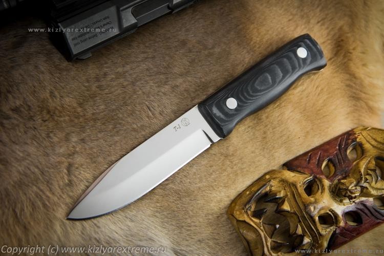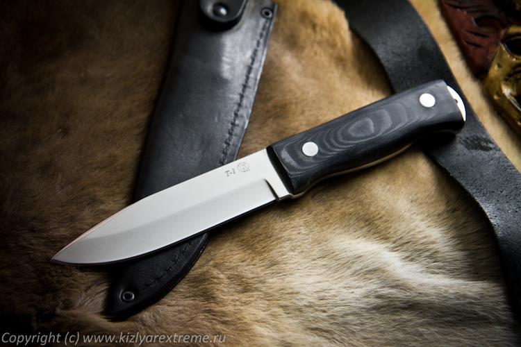 Т-1 из z160 (аналог популярной стали D2 и Х12МФ) с рукоятью из Микарты. Микарта в основном ставится на дорогие и авторские ножи, сейчас это один из самых модных материалов для рукоятей красивых ножей и огнестрельного оружия.