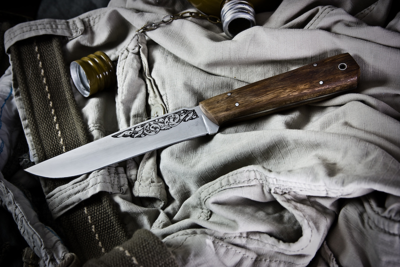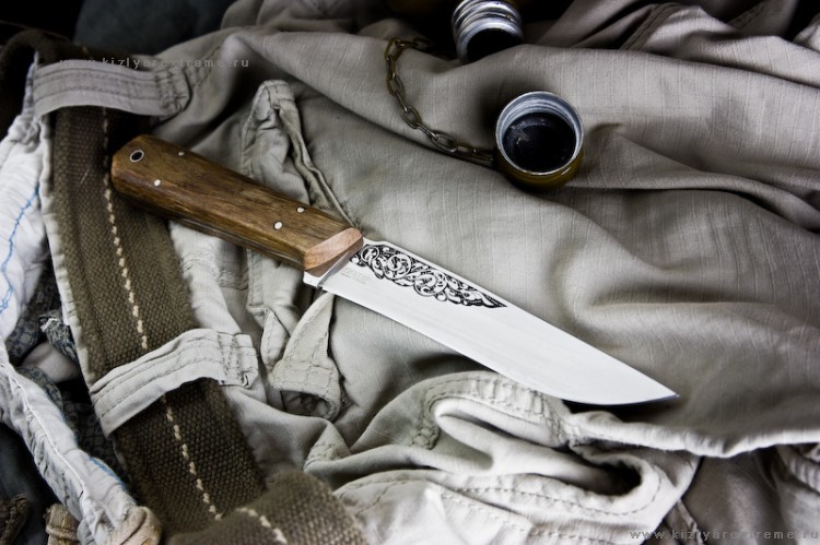 | Геометрия клинка | узкий клинок со скосом обуха, упор под большой палец на прямом обухе клинка, S-образная форма лезвия |