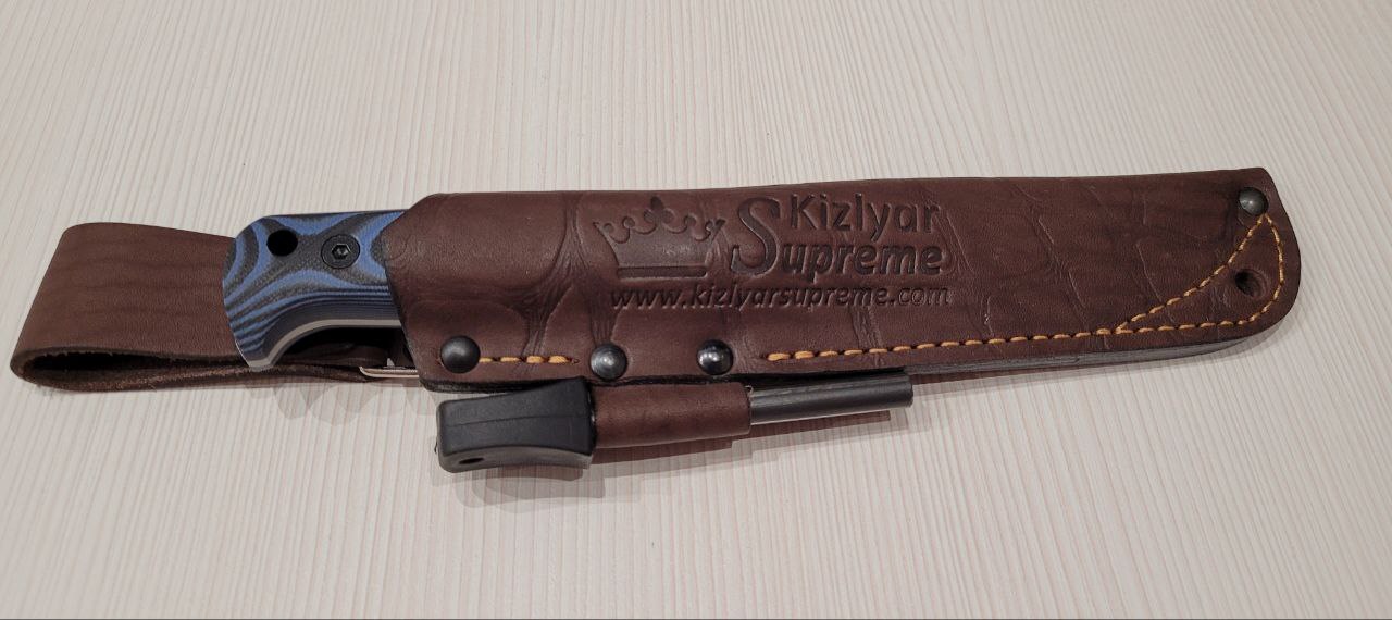 Упакован этот «резучий парень» в ножны из коричневой кожи с двойным подвесом и петлей для огнива.